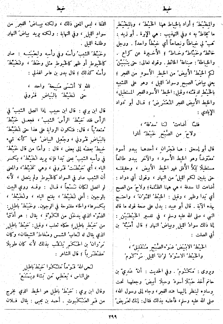؛ يَعْنِي بياضَ الصبحِ وسوادَ اللَّيْلِ، وَهُوَ عَلَى التَّشْبِيهِ بالخَيْطِ لدِقَّته، وَقِيلَ: الخيطُ الأَسود الْفَجْرُ الْمُسْتَطِيلُ، وَالْخَيْطُ الأَبيض الْفَجْرُ المُعْتَرِضُ؛ قَالَ أَبو دُواد الإِيادي:
