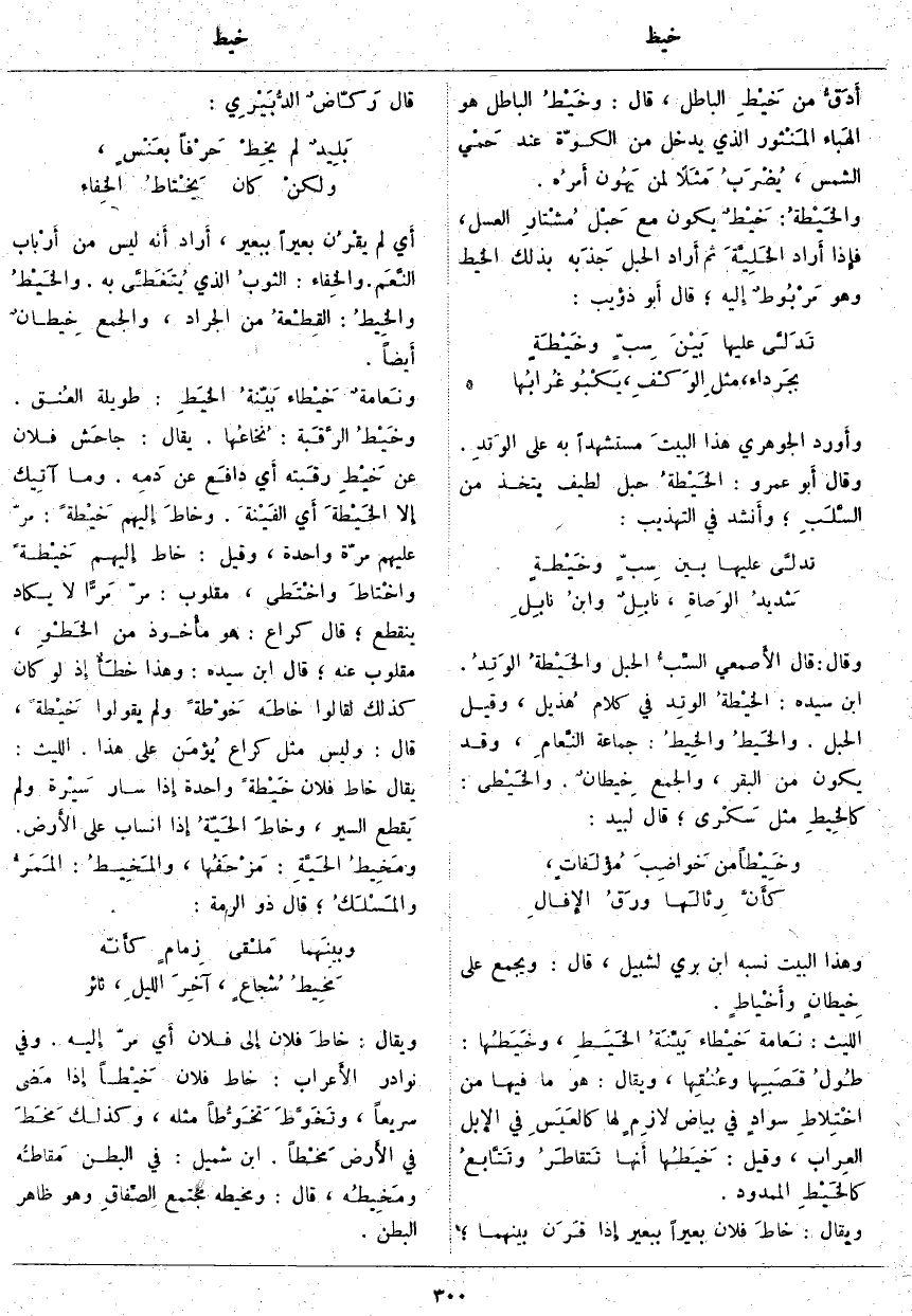 وَقَالَ: قَالَ الأَصمعي السِّبُّ الْحَبْلُ والخَيْطةُ الوَتِدُ. ابْنُ سِيدَهْ: الخيْطة الوتِد فِي كَلَامِ هُذيل، وَقِيلَ الْحَبْلُ. والخَيْطُ والخِيطُ: جَمَاعَةُ النَّعامِ، وَقَدْ يَكُونُ مِنَ الْبَقَرِ، وَالْجَمْعُ خِيطانٌ. والخَيْطى: كالخِيطِ مِثْلُ سَكْرى؛ قَالَ لَبِيدٌ: