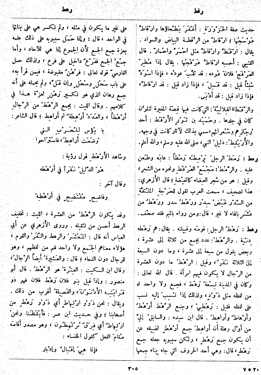 رهط: رَهْطُ الرجلِ: قومُه وَقَبِيلَتُهُ. يُقَالُ: هُمْ رَهْطه دِنْية. والرَّهْطُ: عَدَدٌ يَجْمَعُ مِنْ ثَلَاثَةٍ إِلى عَشَرَةٍ، وَبَعْضٌ يَقُولُ مِنْ سَبْعَةٍ إِلى عَشَرَةٍ، وَمَا دُونَ السَّبْعَةِ إِلى الثَّلَاثَةِ نَفَرٌ، وَقِيلَ: الرَّهْطُ مَا دُونَ الْعَشَرَةِ مِنَ الرِّجَالِ لَا يَكُونُ فِيهِمُ امرأَة. قَالَ اللَّهُ تَعَالَى: وَكانَ فِي الْمَدِينَةِ تِسْعَةُ رَهْطٍ