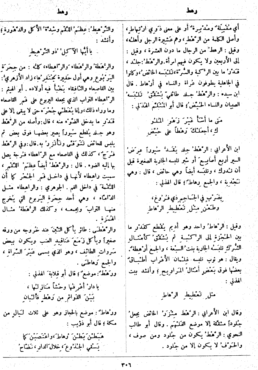 وَقَالَ ابْنُ الأَعرابي: الرَّهْط مِئْزَرُ الْحَائِضِ يجعلُ جُلوداً مشقَّقة إِلا مَوْضِعَ الفَلْهَم. وَقَالَ أَبو طَالِبٍ النَّحْوِيُّ: الرَّهْطُ يَكُونُ مِنْ جُلود وَمِنْ صُوفٍ، والحَوْفُ لَا يَكُونُ إِلا مِنَ جُلود. والتَّرْهيطُ: عِظَمُ اللَّقْم وشِدَّةُ الأَكل والدَّهْورةِ؛ وأَنشد: