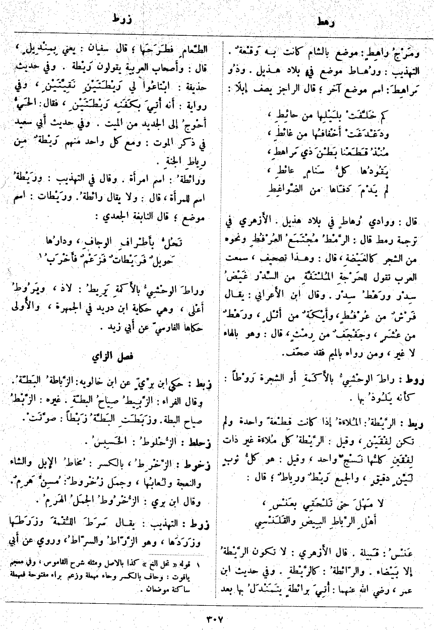 قَالَ: وَوَادِي رُهاطٍ فِي بِلَادِ هُذَيْلٍ. الأَزهري فِي تَرْجَمَةِ رَمَطَ قَالَ: الرَّمْطُ مُجْتَمَعُ العُرْفُطِ وَنَحْوِهِ مِنَ الشَّجَرِ كالغَيْضةِ، قَالَ: وَهَذَا تَصْحِيفٌ، سَمِعْتُ الْعَرَبَ تَقُولُ للحَرْجةِ المُلْتَفَّةِ مِنَ السِّدْر غَيْضُ سِدْر ورَهْطُ سِدْر. وَقَالَ ابْنُ الأَعرابي: يُقَالُ فَرْشٌ مِنْ عُرْفُطٍ، وأَيْكَةٌ مِنْ أَثْلٍ، ورَهْطٌ مِنْ عُشَرٍ، وجَفْجَفٌ مِنْ رِمْثٍ، قَالَ: وَهُوَ بِالْهَاءِ لَا غَيْرَ، وَمَنْ رَوَاهُ بالميم فقد صحّف.