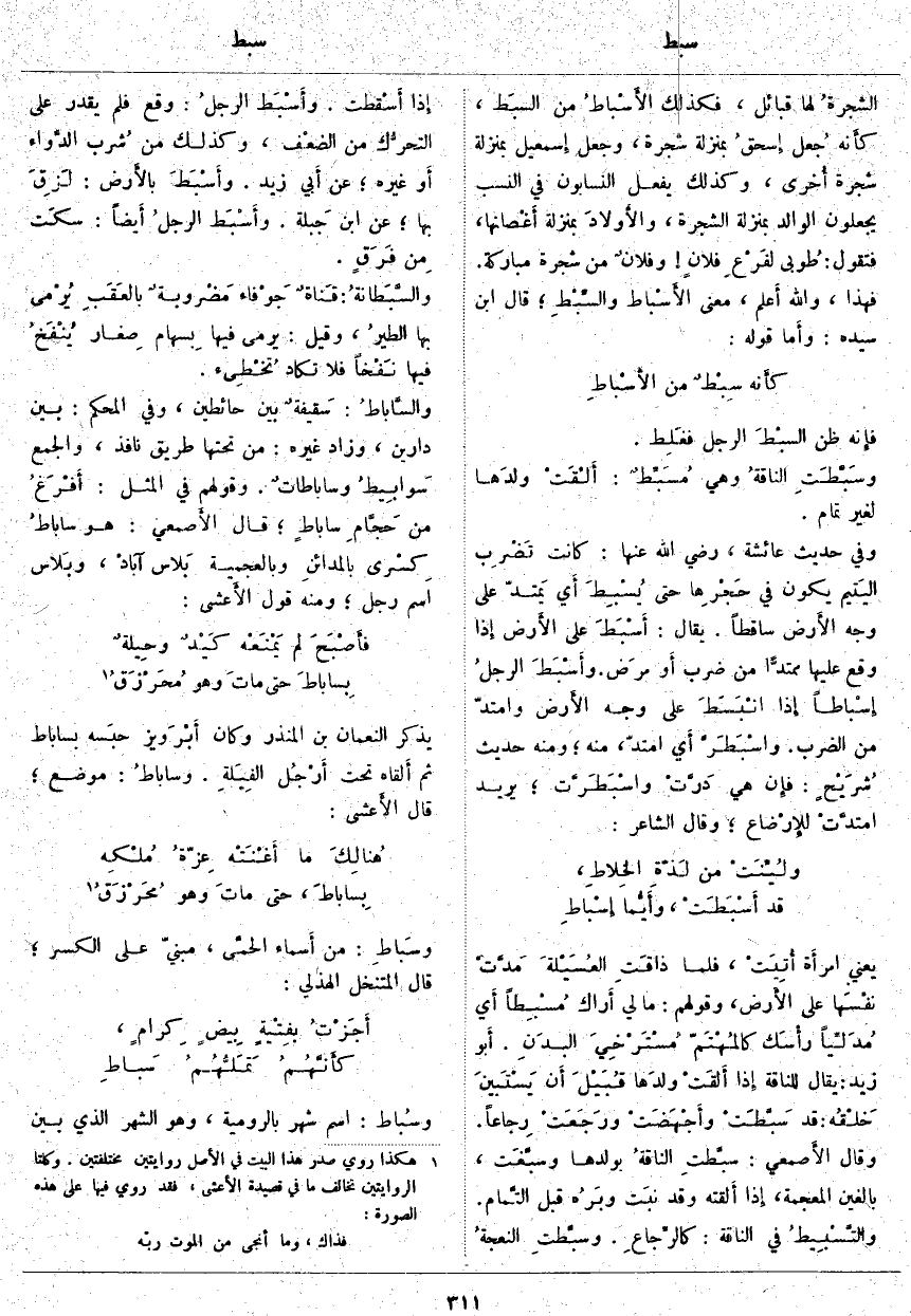 يَعْنِي امرأَة أُتِيَتْ، فَلَمَّا ذاقَتِ العُسَيْلةَ مَدَّتْ نفْسَها عَلَى الأَرض، وَقَوْلُهُمْ: مَا لِي أَراك مُسْبِطاً أَي مُدَلِّياً رأْسَك كالمُهْتَمّ مُسْتَرْخِيَ البدَنِ. أَبو زَيْدٍ: يُقَالُ لِلنَّاقَةِ إِذا أَلقَتْ ولدَها قُبَيْلَ أَن يَسْتَبينَ خَلْقُه: قَدْ سَبَّطَتْ وأَجْهَضَتْ ورَجَعَتْ رِجاعاً. وَقَالَ الأَصمعي: سبَّطتِ الناقةُ بِوَلَدِهَا وسبَّغَت، بِالْغَيْنِ الْمُعْجَمَةِ، إِذا أَلقته وَقَدْ نبَت وبَرُه قَبْلَ التَّمام. والتَّسْبِيطُ فِي النَّاقَةِ: كالرِّجاعِ. وسبَّطتِ النعجةُ إِذا أَسْقطت. وأَسْبَط الرجلُ: وَقَعَ فَلَمْ يَقْدِرْ عَلَى التحرُّك مِنَ الضعْف، وَكَذَلِكَ مِنْ شُرب الدَّواء أَو غَيْرُهُ؛ عَنْ أَبي زَيْدٍ. وأَسْبَطَ بالأَرض: لَزِقَ بِهَا؛ عَنِ ابْنِ جَبلة. وأَسْبَط الرجلُ أَيضاً: سكَت مِن فَرَقٍ. والسَّبَطانةُ: قَناةٌ جَوْفاء مَضْروب بالعَقَبِ يُرْمى بِهَا الطيرُ، وَقِيلَ: يُرْمَى فِيهَا بِسهام صِغار يُنْفَخُ فِيهَا نَفْخاً فَلَا تَكَادُ تُخْطِئ. والسَّاباطُ: سَقيفةٌ بَيْنَ حَائِطَيْنِ، وَفِي الْمُحْكَمِ: بَيْنَ دَارَيْنِ، وَزَادَ غَيْرُهُ: مِنْ تَحْتِهَا طَرِيقٌ نَافِذٌ، وَالْجَمْعُ سَوابِيطُ وساباطاتٌ. وَقَوْلُهُمْ فِي الْمَثَلِ: أَفْرَغُ مِنْ حَجَّامِ ساباطٍ؛ قَالَ الأَصمعي: هُوَ ساباطُ كِسْرى بالمدائنِ وَبِالْعَجَمِيَّةِ بَلاس آبادْ، وبَلاس اسْمُ رَجُلٍ؛ وَمِنْهُ قَوْلُ الأَعشى: