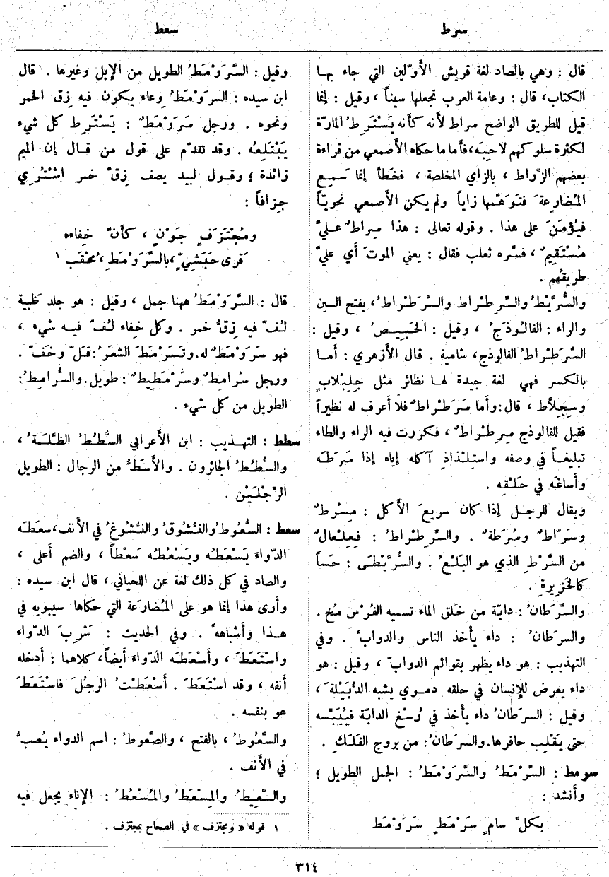 ، فسَّره ثَعْلَبٌ فَقَالَ: يَعْنِي الموتَ أَي عليَّ طريقُهم. والسُّرَّيْطُ والسِّرِطْراط والسَّرَطْراطُ، بِفَتْحِ السِّينِ وَالرَّاءِ: الفالُوذَجُ، وَقِيلَ: الخَبِيصُ، وَقِيلَ: السَّرَطْراطُ الْفَالُوذَجُ، شَامِيَّةٌ. قَالَ الأَزهري: أَما بِالْكَسْرِ فَهِيَ لُغَةٌ جَيِّدَةٌ لَهَا نَظَائِرُ مِثْلَ جِلِبْلابٍ وسِجِلَّاط، قَالَ: وأَما سَرَطْراطٌ فَلَا أَعرف لَهُ نَظِيرًا فَقِيلَ لِلْفَالُوذَجِ سِرِطْراطٌ، فَكَرَّرْتُ فِيهِ الرَّاءَ وَالطَّاءَ تَبْلِيغًا فِي وَصْفِهِ واستِلْذاذِ آكِلِهِ إِياه إِذا سَرَطَه وأَساغَه فِي حَلْقِه. وَيُقَالُ لِلرَّجُلِ إِذا كَانَ سريعَ الأَكل: مِسْرَطٌ وسَرّاطٌ وسُرَطةٌ. والسِّرِطْراطُ: فِعِلْعالٌ مِنَ السَّرْطِ الَّذِي هُوَ البَلْع. والسُّرَّيْطَى: حَساً كالخَزِيرةِ. والسَّرَطانُ: دَابَّةٌ مِنْ خَلق الْمَاءِ تَسْمِيَةُ الفُرْس مُخ. والسرَطانُ: دَاءٌ يأْخذ النَّاسَ والدوابَّ. وَفِي التَّهْذِيبِ: هُوَ دَاءٌ يَظْهَرُ بِقَوَائِمِ الدَّوَابِّ، وَقِيلَ: هُوَ دَاءٌ يُعَرِّضُ للإِنسان فِي حَلْقِهِ دَمَوِيٌّ يُشْبِهُ الدُّبَيْلةَ، وَقِيلَ: السرَطانُ دَاءٌ يأْخذ فِي رُسْغ الدَّابَّةِ فيُيَبِّسه حَتَّى يَقْلِب حَافِرَهَا. والسرَطانُ: من بروج الفَلَكِ.