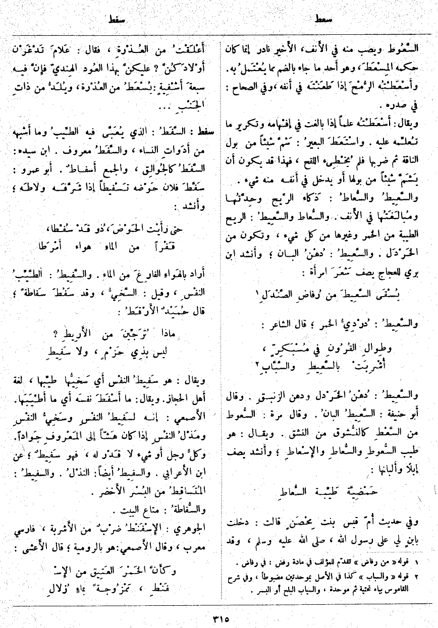 وَيُقَالُ: هُوَ سَفِيطُ النفْس أَي سَخِيُّها طيِّبها، لُغَةُ أَهل الْحِجَازِ. وَيُقَالُ: مَا أَسْفَطَ نفسَه أَي مَا أَطْيَبَها. الأَصمعي: إِنه لسَفِيطُ النفْسِ وسَخِيُّ النفْسِ ومَذْلُ النفْسِ إِذا كَانَ هَشّاً إِلى المَعْروفِ جَواداً. وكلُّ رَجُلٍ أَو شَيْءٍ لَا قَدْر لَهُ، فَهُوَ سَفِيطٌ؛ عَنِ ابْنِ الأَعرابي. والسفِيطُ أَيضاً: النذْلُ. والسفيطُ: المُتَساقِطُ مِنَ البُسْر الأَخضر. والسُّفاطةُ: مَتَاعُ الْبَيْتِ. الْجَوْهَرِيُّ: الإِسْفَنْطُ ضرْبٌ مِنَ الأَشربة، فَارِسِيٌّ مُعَرَّبٌ، وَقَالَ الأَصمعي: هُوَ بِالرُّومِيَّةِ؛ قَالَ الأَعشى: