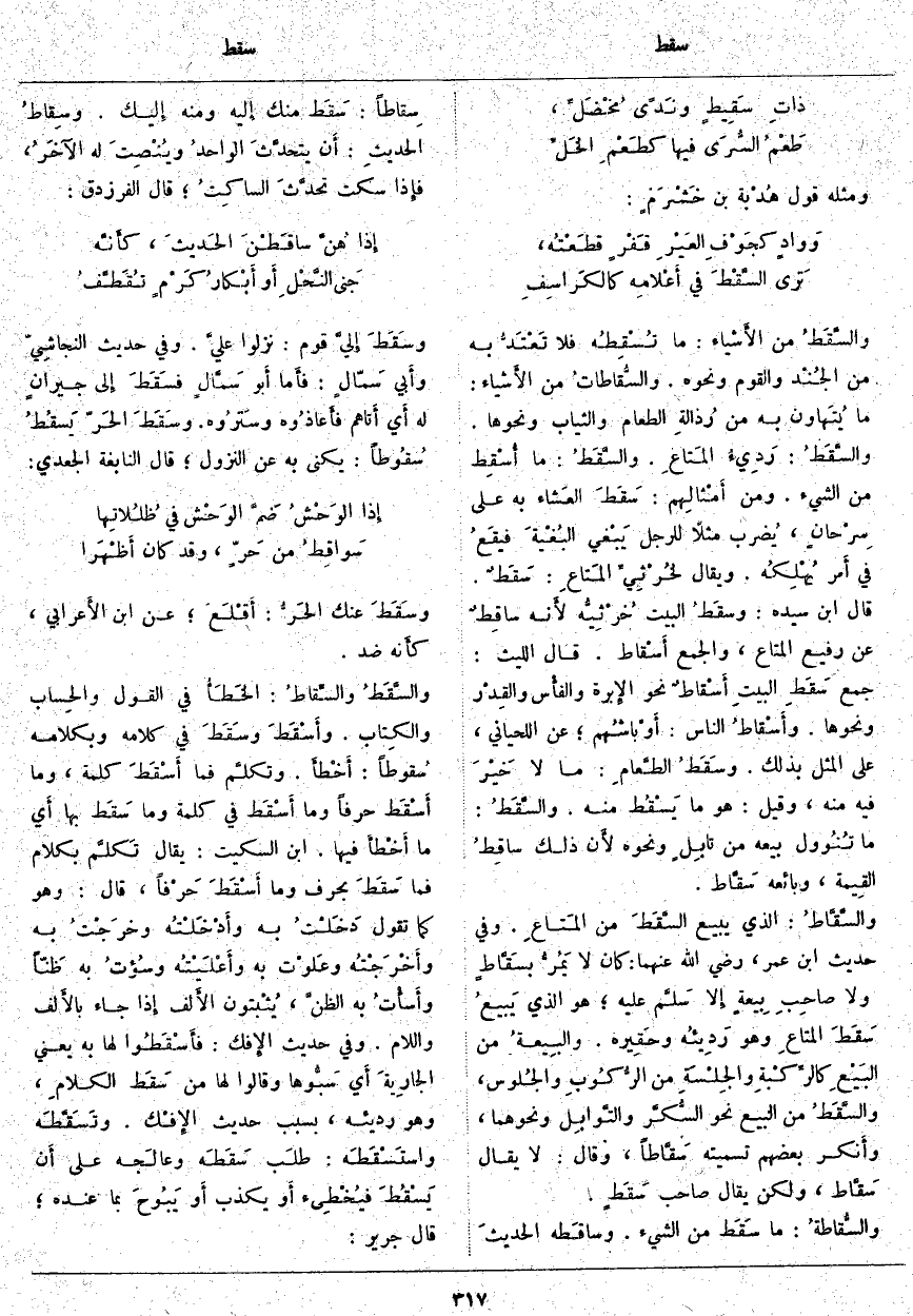 والسَّقَطُ مِنَ الأَشياء: مَا تُسْقِطهُ فَلَا تَعْتَدُّ بِهِ مِنَ الجُنْد وَالْقَوْمِ وَنَحْوِهِ. والسُّقاطاتُ مِنَ الأَشياء: مَا يُتَهاون بِهِ مِنْ رُذالةِ الطَّعَامِ وَالثِّيَابِ وَنَحْوِهَا. والسَّقَطُ: رَدِيءُ المَتاعِ. والسَّقَطُ: مَا أُسْقِط مِنَ الشَّيْءِ. وَمِنْ أَمْثالِهم: سَقَطَ العَشاء بِهِ عَلَى سِرْحانٍ، يُضرب مَثَلًا لِلرَّجُلِ يَبْغي البُغْيةَ فيقَعُ فِي أَمر يُهْلِكُه. وَيُقَالُ لخُرْثِيِّ المَتاعِ: سَقَطٌ. قَالَ ابْنُ سِيدَهْ: وسقَطُ الْبَيْتِ خُرْثِيُّه لأَنه ساقِطٌ عَنْ رَفِيعِ الْمَتَاعِ، وَالْجَمْعُ أَسْقاط. قَالَ اللَّيْثُ: جَمْعُ سَقَطِ البيتِ أَسْقاطٌ نَحْوَ الإِبرة والفأْس والقِدْر وَنَحْوِهَا. وأَسْقاطُ النَّاسِ: أَوْباشُهم؛ عَنِ اللِّحْيَانِيِّ، على المثل بذلك. وسَقَطُ الطَّعامِ: مَا لَا خَيْرَ فِيهِ مِنْهُ، وَقِيلَ: هُوَ مَا يَسْقُط مِنْهُ. والسَّقَطُ: مَا تُنُوول بَيْعُهُ مِنْ تابِلٍ وَنَحْوِهِ لأَن ذَلِكَ ساقِطُ القِيمة، وَبَائِعُهُ سَقَّاط. والسَّقَّاطُ: الَّذِي يَبِيعُ السَّقَطَ مِنَ المَتاعِ. وَفِي حَدِيثِ