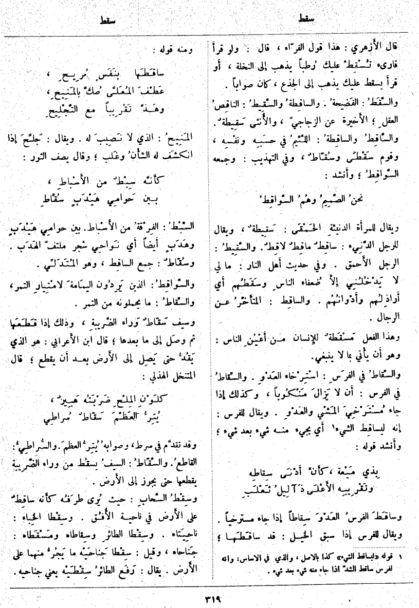 قَالَ الأَزهري: هَذَا قَوْلُ الْفَرَّاءِ، قَالَ: وَلَوْ قرأَ قَارِئٌ تُسْقِطْ عَلَيْكِ رُطباً يَذْهَبُ إِلى النَّخْلَةِ، أَو قرأَ يُسْقِطْ عَلَيْكِ يَذْهَبُ إِلى الْجِذْعِ، كَانَ صَوَابًا. والسَّقَطُ: الفَضيحةُ. والساقِطةُ والسَّقِيطُ: الناقِصُ العقلِ؛ الأَخيرة عَنِ الزَّجَّاجِيِّ، والأُنثى سَقِيطةٌ. والسَّاقِطُ والساقِطةُ: اللَّئيمُ فِي حسَبِه ونفْسِه، وَقَوْمٌ سَقْطَى وسُقّاطٌ، وَفِي التَّهْذِيبِ: وَجَمْعُهُ السَّواقِطُ؛ وأَنشد: