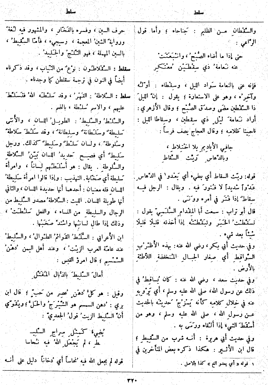 سلط: السَّلاطةُ: القَهْرُ، وَقَدْ سَلَّطَه اللهُ فتَسَلَّطَ عَلَيْهِمْ، وَالِاسْمُ سُلْطة، بِالضَّمِّ. والسَّلْطُ والسَّلِيطُ: الطويلُ اللسانِ، والأُنثى سَلِيطةٌ وسَلَطانةٌ وِ سِلِطانةٌ، وَقَدْ سَلُطَ سَلاطةً وسُلوطةً، وَلِسَانٌ سَلْطٌ وسَلِيطٌ كَذَلِكَ. وَرَجُلٌ سَلِيطٌ أَي فَصِيحٌ حَدِيدُ اللِّسَانِ بَيّنُ السَّلاطةِ والسُّلوطةِ. يُقَالُ: هُوَ أَسْلَطُهم لِساناً، وامرأَة سَليطة أَي صَخّابة. التَّهْذِيبِ: وإِذا قَالُوا امرأَة سَلِيطةُ اللسانِ فَلَهُ مَعْنَيَانِ: أَحدهما أَنها حَدِيدَةُ اللِّسَانِ، وَالثَّانِي أَنها طَوِيلَةُ اللِّسَانِ. اللَّيْثُ: السَّلاطةُ مَصْدَرُ السَّلِيط مِنَ الرِّجَالِ والسلِيطةِ مِنَ النِّسَاءِ، وَالْفِعْلُ سَلُطَتْ، وَذَلِكَ إِذا طَالَ لسانُها واشتدَّ صَخَبُها. ابْنُ الأَعرابي: السُّلُطُ القَوائمُ الطِّوالُ، والسَّلِيطُ عِنْدَ عَامَّةِ الْعَرَبِ الزيْتُ، وَعِنْدَ أَهل الْيَمَنِ دُهْنُ السِّمْسِم؛ قَالَ امْرُؤٌ الْقَيْسَ: