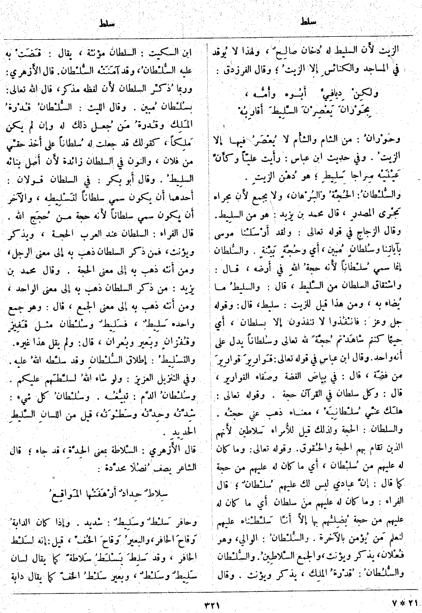 ؛ هُوَ دُهْن الزيتِ. والسُّلْطانُ: الحُجَّةُ والبُرْهان، وَلَا يُجْمَعُ لأَن مَجْرَاهُ مَجْرى المصدرِ، قَالَ مُحَمَّدُ بْنُ يَزِيدَ: هُوَ مِنَ السلِيط. وَقَالَ الزَّجَّاجُ فِي قَوْلِهِ تَعَالَى: وَلَقَدْ أَرْسَلْنا مُوسى بِآياتِنا وَسُلْطانٍ مُبِينٍ*