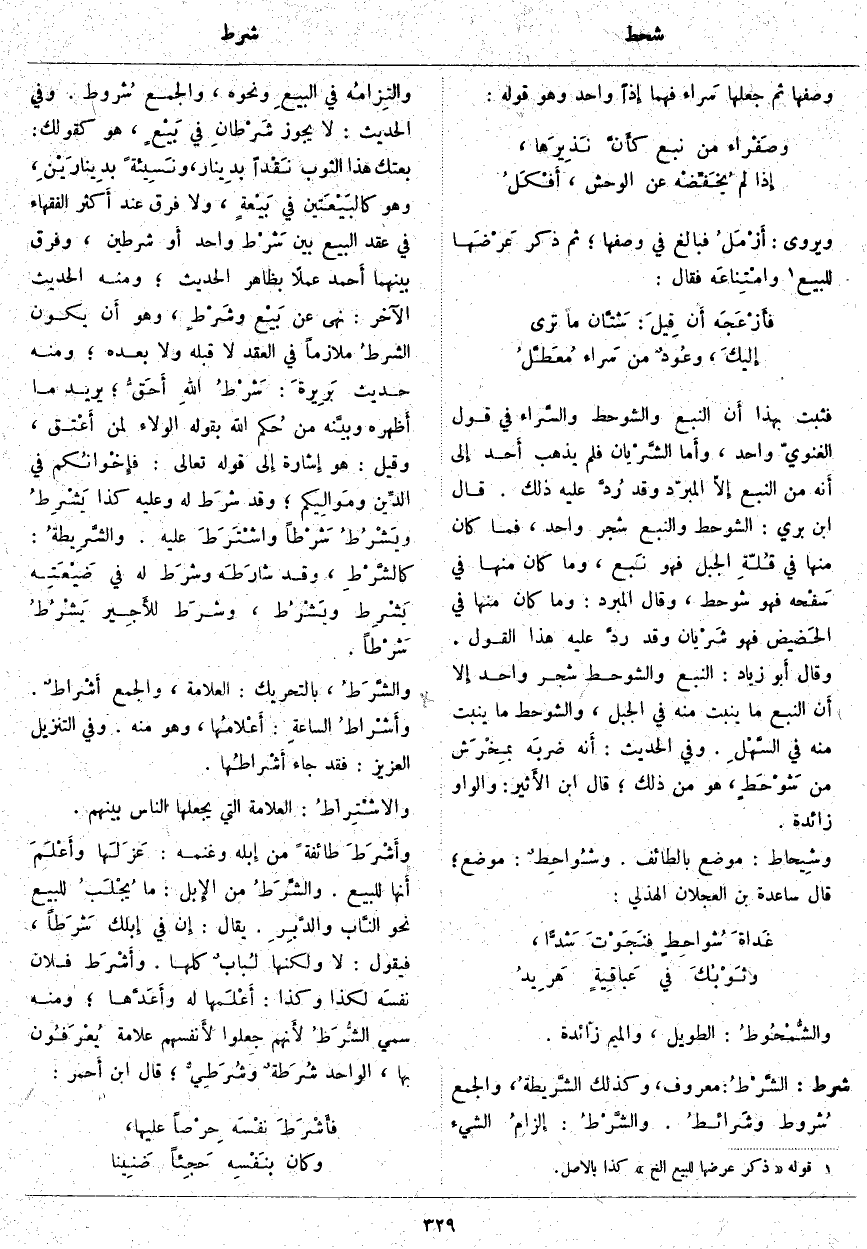 شرط: الشَّرْطُ: مَعْرُوفٌ، وَكَذَلِكَ الشَّريطةُ، وَالْجَمْعُ شُروط وشَرائطُ. والشَّرْطُ: إِلزامُ الشَّيْءِ والتِزامُه فِي البيعِ وَنَحْوِهِ، وَالْجَمْعُ شُروط. وَفِي الْحَدِيثِ: