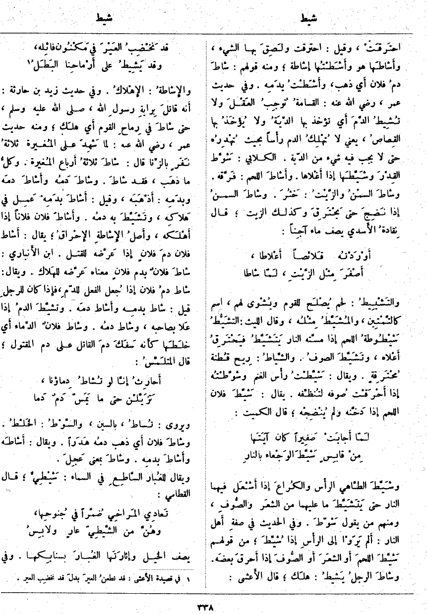 أَي تُؤْخَذُ بِهَا الدِّيَةُ وَلَا يُؤْخَذُ بِهَا القِصاصُ، يَعْنِي لَا تُهْلِكُ الدَّمَ رأْساً بِحَيْثُ تُهْدِرُه حَتَّى لَا يَجِبَ فِيهِ شَيْءٌ مِنَ الدِّيَةِ. الْكِلَابِيُّ: شَوَّط القِدْرَ وشَيَّطَها إِذا أَغْلاها. وأَشاطَ اللَّحْمَ: فَرَّقه. وشاطَ السمْنُ والزَّيْتُ: خَثُرَ. وشاطَ السمنُ إِذا نَضِجَ حَتَّى يَحْتَرِقَ وَكَذَلِكَ الزَّيْتُ؛ قَالَ نِقادةُ الأَسدي يَصِفُ مَاءً آجِناً: