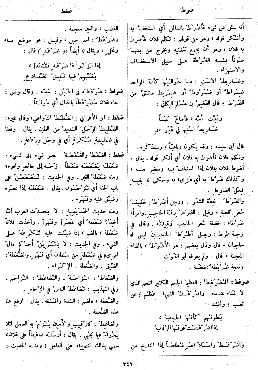 ضغط: الضَّغْطُ والضَّغْطةُ: عَصْرُ شَيْءٍ إِلى شَيْءٍ. ضَغَطَه يَضْغَطُه ضَغْطاً: زَحَمه إِلى حائطٍ وَنَحْوِهِ، وَمِنْهُ ضَغْطةُ الْقَبْرِ. وَفِي الْحَدِيثِ: