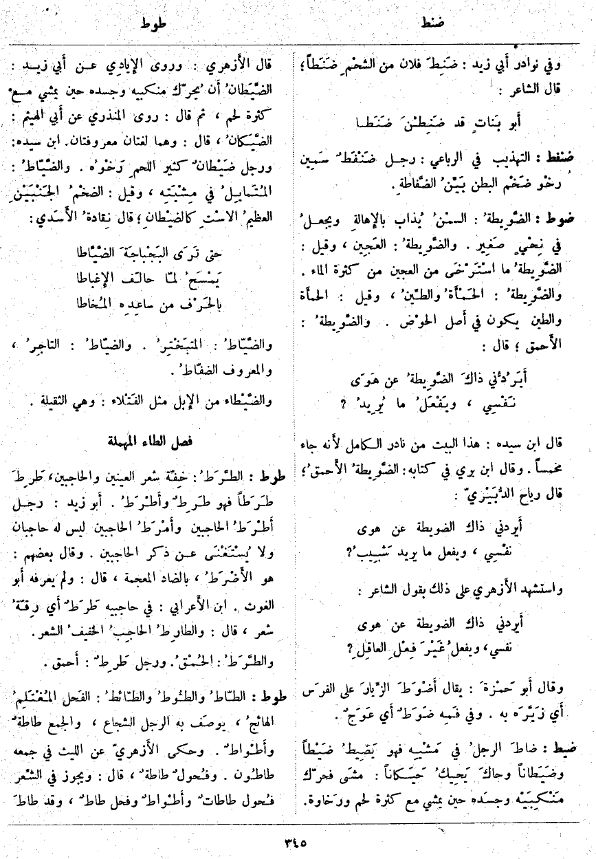 ضيط: ضاطَ الرجلُ فِي مَشْيِه فَهُوَ يَضِيطُ ضَيْطاً وضَيَطاناً وحاكَ يَحِيكُ حَيَكاناً: مشَى فَحَرَّكَ مَنْكِبَيْه وجسَده حِينَ يَمْشِي مَعَ كَثْرَةِ لَحْمٍ ورَخاوة. قَالَ الأَزهري: وَرَوَى الإِيادِي عَنْ أَبي زَيْدٍ: الضَّيَطانُ أَن يُحرّك مَنْكِبَيْهِ وَجَسَدَهُ حِينَ يَمْشِي مَعَ كَثْرَةِ لَحْمٍ، ثُمَّ قَالَ: رَوَى الْمُنْذِرِيُّ عَنْ أَبي الْهَيْثَمِ: الضَّيَكانُ، قَالَ: وَهُمَا لُغَتَانِ مَعْرُوفَتَانِ. ابْنُ سِيدَهْ: وَرَجُلٌ ضَيْطانٌ كَثِيرُ اللحمِ رَخْوُه. والضَّيّاطُ: المُتَمايِلُ فِي مِشْيَتِه، وَقِيلَ: الضخْمُ الجَنْبَيْنِ العظيمُ الاسْتِ كالضيْطانِ؛ قَالَ نِقادةُ الأَسَدي: