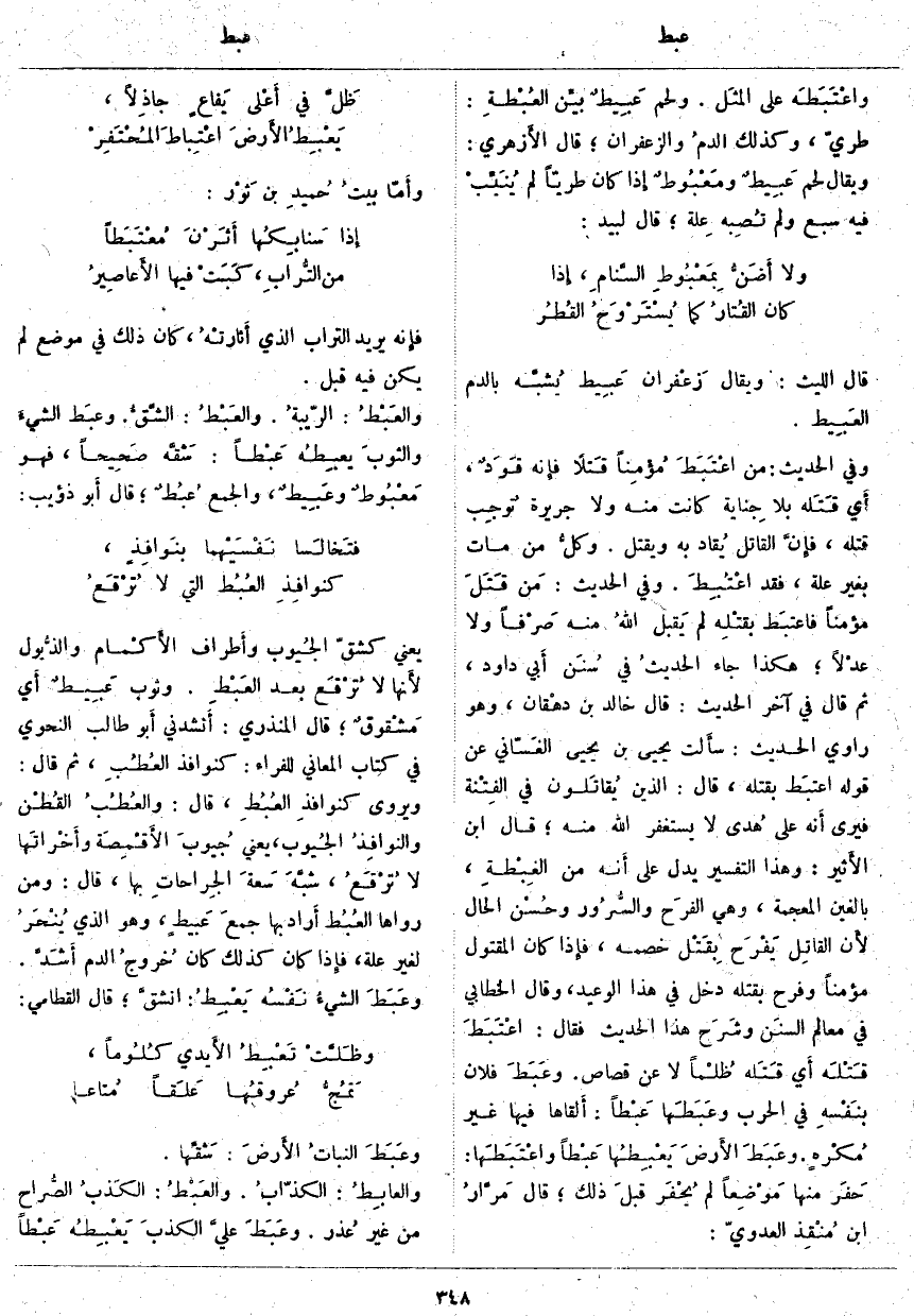 ؛ هَكَذَا جَاءَ الحديثُ فِي سُنَن أَبي دَاوُدَ، ثُمَّ قَالَ فِي آخِرِ الْحَدِيثِ: قَالَ خَالِدُ بْنُ دهْقان، وَهُوَ رَاوِي الْحَدِيثِ: سأَلت يَحْيَى بْنَ يَحْيَى الغَسّاني عَنْ قَوْلِهِ اعتبَط بِقَتْلِهِ، قَالَ: الَّذِينَ يُقاتَلون فِي الفِتْنة فَيَرَى أَنه عَلَى هُدى لَا يَسْتَغْفِرُ اللَّهَ مِنْهُ؛ قَالَ ابْنُ الأَثير: وَهَذَا التَّفْسِيرُ يَدُلُّ عَلَى أَنه مِنَ الغِبْطةِ، بِالْغَيْنِ الْمُعْجَمَةِ، وَهِيَ الفرَح والسُّرُور وحُسْن الْحَالِ لأَن القاتِل يَفْرَح بِقَتْل خَصْمِهِ، فإِذا كَانَ الْمَقْتُولُ مُؤْمِنًا وَفَرِحَ بِقَتْلِهِ دَخَلَ فِي هَذَا الْوَعِيدِ، وَقَالَ الْخَطَّابِيُّ فِي مَعَالِمِ السنَن وشَرَح هَذَا الْحَدِيثَ فَقَالَ: اعْتَبَطَ قَتْلَه أَي قَتَله ظُلْماً لَا عَنْ قَصَاصٍ. وعَبَطَ فُلَانٌ بنَفْسِه فِي الْحَرْبِ وعَبَطَها عَبْطاً: أَلقاها فِيهَا غَيْرَ مُكْرهٍ. وعَبَطَ الأَرضَ يَعْبِطُها عَبْطاً واعْتَبَطَها: حَفَر مِنْهَا مَوْضِعاً لَمْ يُحْفَر قبلَ ذَلِكَ؛ قَالَ مَرَّارُ بْنُ مُنْقِذ الْعَدَوِيُّ: