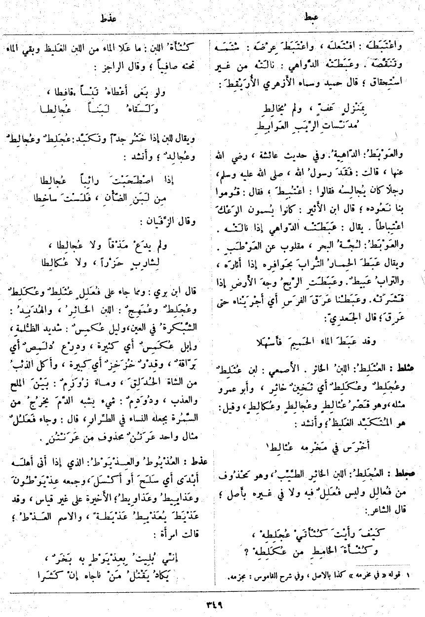عجلط: العُجَلِطُ: اللَّبَنُ الخاثِر الطَّيِّبُ، وَهُوَ مَحْذُوف مِنْ فُعالِل وَلَيْسَ فُعَلِلٌ فِيهِ وَلَا فِي غَيْرِهِ بأَصل؛ قَالَ الشَّاعِرُ: