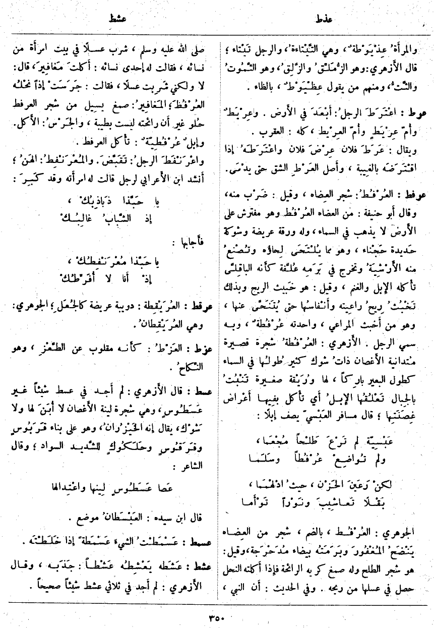 عرفط: العُرْفُطُ: شَجَرُ العِضاه، وَقِيلَ: ضَرْب مِنْهُ، وَقَالَ أَبو حَنِيفَةَ: مِنْ الْعِضَاهِ العُرْفُط وَهُوَ مُفْتَرِشٌ عَلَى الأَرض لَا يَذْهَبُ فِي السَّمَاءِ، وَلَهُ وَرَقَةٌ عَرِيضَةٌ وَشَوْكَةٌ حَديدة حَجْناء، وَهُوَ مِمَّا يُلْتَحَى لِحاؤُه وتُصْنعُ مِنْهُ الأَرْشِيَةُ وَتَخْرُجُ فِي بَرَمِه عُلَّفة كأَنه الباقِلَّى تأْكله الإِبل وَالْغَنَمُ، وَقِيلَ: هُوَ خَبيث الرِّيحِ وَبِذَلِكَ تَخْبُتْ رِيحُ راعِيته وأَنْفاسُها حَتَّى يُتَنَحَّى عَنْهَا، وَهُوَ مِنْ أَخبث الْمَرَاعِي، وَاحِدَتُهُ عُرْفُطةٌ، وَبِهِ سُمِّيَ الرَّجُلُ. الأَزهري: العُرْفُطةُ شَجَرَةٌ قَصِيرَةٌ مُتدانية الأَغصان ذاتُ شَوْكٍ كَثِيرٍ طُولُها فِي السَّمَاءِ كَطُولِ الْبَعِيرِ بارِكاً، لَهَا وُرَيْقة صَغِيرَةٌ تَنْبُتُ بالجِبال تَعْلُقُها الإِبلُ أَي تأْكل بفِيها أَعْراض غِصَنَتِها؛ قَالَ مُسَافِرٌ العَبْسيّ يَصِفُ إِبلًا: