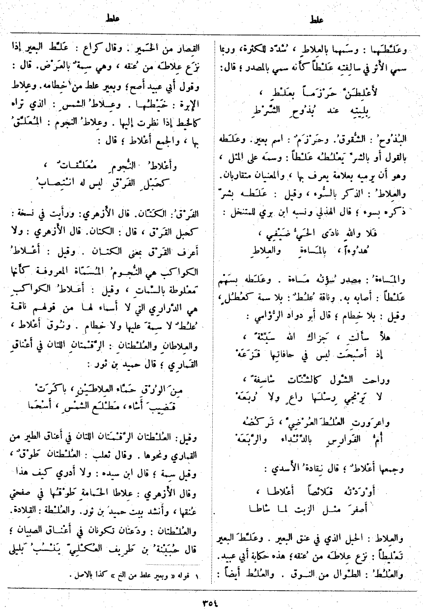 والعِلاط: الْحَبْلُ الَّذِي فِي عُنُقِ الْبَعِيرِ. وعَلَّطَ الْبَعِيرَ تَعْليطاً: نَزَعَ عِلاطَه مِنْ عُنقه؛ هَذِهِ حِكَايَةُ أَبي عُبَيْدٍ. والعُلُطُ: الطِّوال مِنَ النُّوقِ. والعُلُط أَيضاً: القِصار مِنَ الحَمير. وَقَالَ كُرَاعٌ: عَلَّط الْبَعِيرَ إِذا نزَع عِلاطَه مِنْ عُنقه، وَهِيَ سِمةٌ بالعَرْض. قَالَ: وَقَوْلُ أَبي عُبَيْدٍ أَصح؛ وَبَعِيرٌ عَلْطٌ مِنْ «3» خِطامه. وعِلاط الإِبرة: خَيْطُها. وعِلاطُ الشمسِ: الَّذِي تَرَاهُ كَالْخَيْطِ إِذا نَظَرْتَ إِليها. وعِلاطُ النُّجُومِ: المُعَلَّقُ بِهَا، وَالْجَمْعُ أَعْلاط؛ قَالَ: