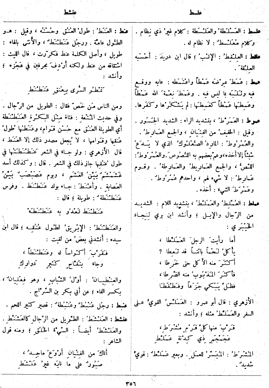 عنشط: العَنْشَطُ: الطَّوِيل مِنَ الرِّجالِ كالعَشَنَّطِ. والعَنْشَطُ أَيضاً: السَّيِءُ الخُلُقِ؛ وَمِنْهُ قَوْلُ الشَّاعِرِ: