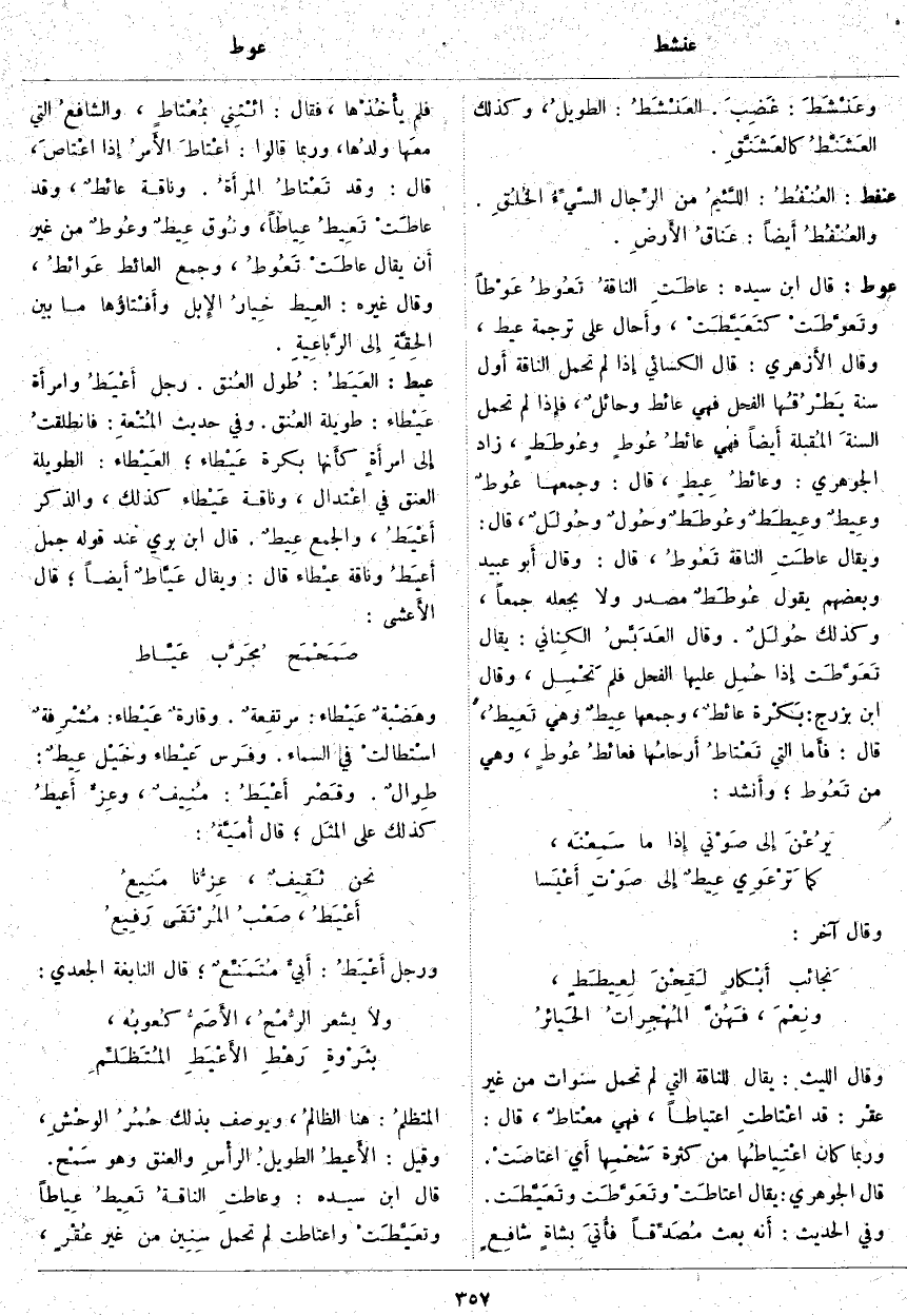 عيط: العَيَطُ: طُول العُنق. رَجُلٌ أَعْيَطُ وامرأَة عَيْطاء: طَوِيلَةُ العُنق. وَفِي حَدِيثِ المُتْعةِ: