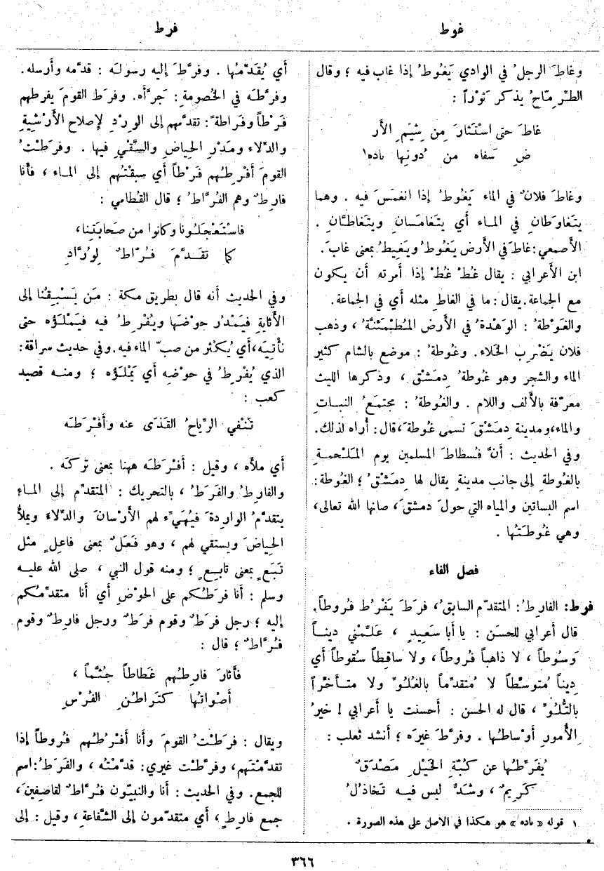 فرط: الفارِطُ: الْمُتَقَدِّمُ السابقُ، فرَطَ يَفْرُط فُروطاً. قَالَ أَعرابي للحسَن: يَا أَبا سَعِيدٍ، عَلِّمْني دِينًا وَسُوطاً، لَا ذَاهِبًا فُروطاً، وَلَا ساقِطاً سُقوطاً أَي دِيناً مُتوسِّطاً لَا مُتقدِّماً بالغُلُوِّ وَلَا متأَخِّراً بالتُّلُوِّ، قَالَ لَهُ الْحَسَنُ: أَحسنت يَا أَعرابي خيرُ الأُمورِ أَوْساطُها. وفرَّطَ غيرَه؛ أَنشد ثَعْلَبٌ: