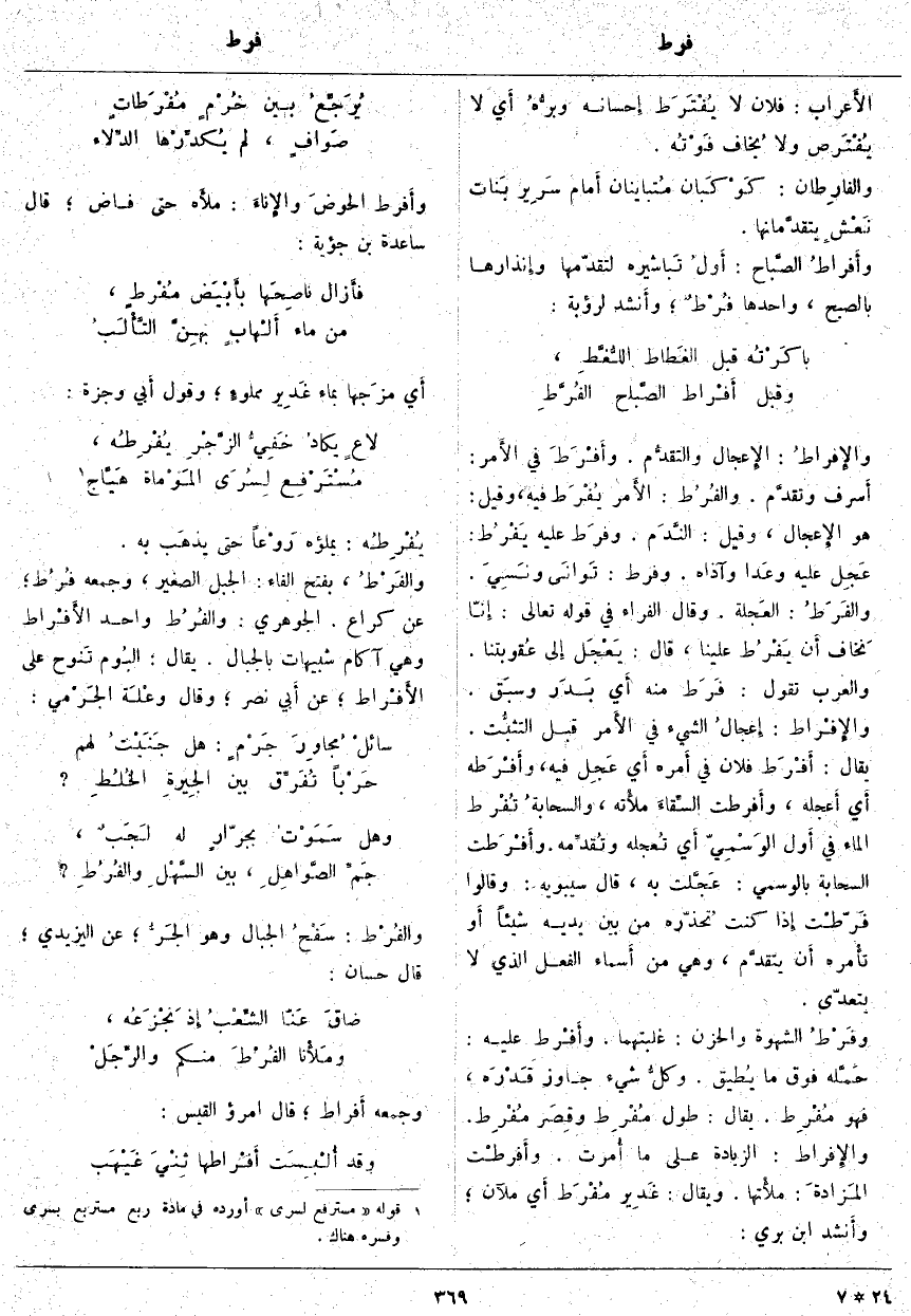 والإِفراطُ: الإِعجال والتقدُّم. وأَفْرَطَ فِي الأَمر: أَسرف وتقدَّم. والفُرُط: الأَمر يُفْرَط فِيهِ، وَقِيلَ: هُوَ الإِعجال، وَقِيلَ: النَّدَم. وفرَط عَلَيْهِ يَفْرُط: عَجِل عَلَيْهِ وعَدا وَآذَاهُ. وَفَرَّطَ: تَوانَى ونَسِيَ. والفَرَطُ: العَجلة. وَقَالَ الْفَرَّاءُ فِي قَوْلِهِ تَعَالَى: إِنَّنا نَخافُ أَنْ يَفْرُطَ عَلَيْنا