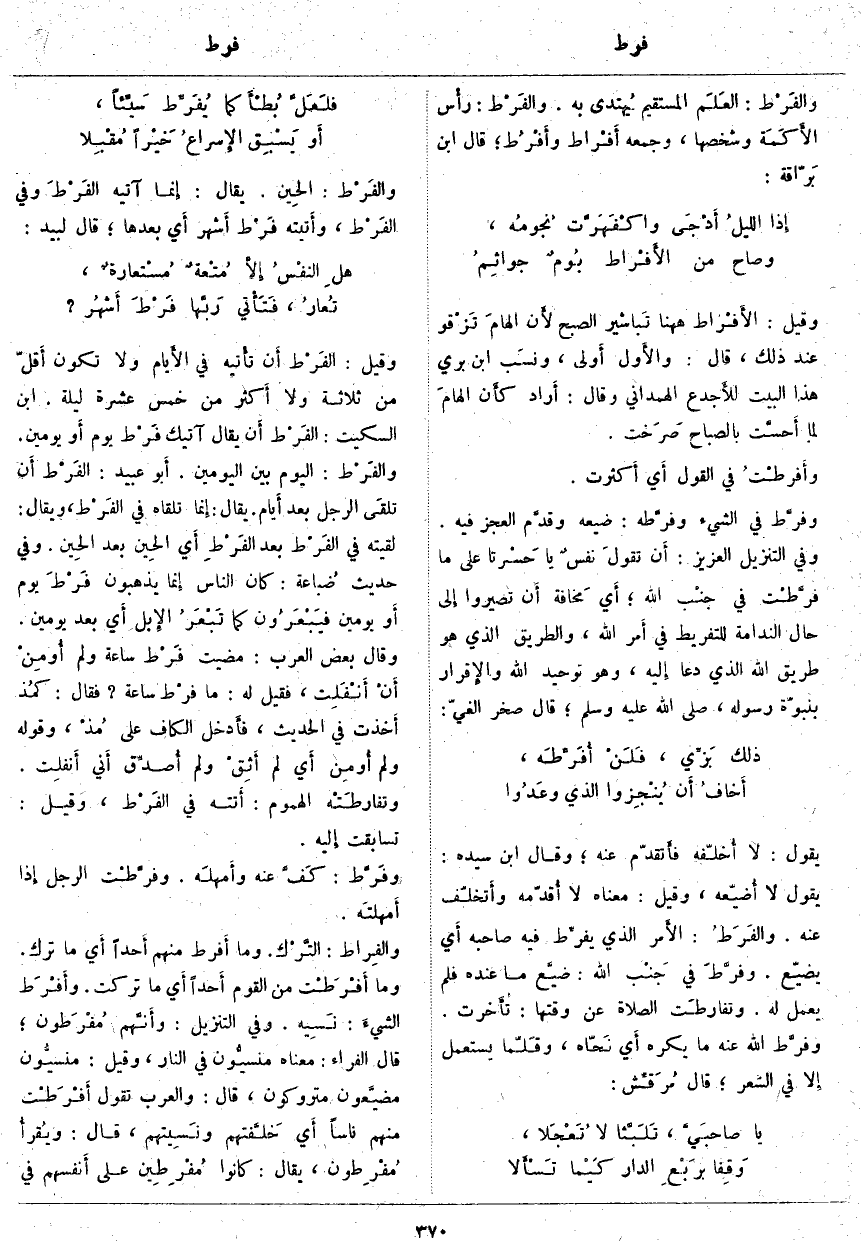 وَقِيلَ: الفَرْط أَن تأْتيه فِي الأَيام وَلَا تَكُونُ أَقلّ مِنْ ثَلَاثَةٍ وَلَا أَكثر مِنْ خَمْسَ عَشْرَةَ لَيْلَةً. ابْنُ السِّكِّيتِ: الفَرْط أَن يُقَالَ آتِيكَ فَرْط يَوْمٍ أَو يَوْمَيْنِ. والفَرْط: الْيَوْمُ بَيْنَ الْيَوْمَيْنِ. أَبو عُبَيْدٍ: الفَرْط أَن تلقَى الرَّجُلَ بَعْدَ أَيام. يُقَالُ: إِنما تَلْقَاهُ فِي الفَرْط، وَيُقَالُ: لَقِيتُهُ فِي الفَرْط بَعْدَ الفَرْطِ أَي الحِين بَعْدَ الحِين. وَفِي حَدِيثِ ضُباعة: كَانَ النَّاسُ إِنما يَذْهَبُونَ فَرْطَ يَوْمٍ أَو يَوْمَيْنِ فيَبْعَرُون كَمَا تَبْعَرُ الإِبل أَي بَعْدَ يَوْمَيْنِ. وَقَالَ بَعْضُ الْعَرَبِ: مَضَيْتُ فَرْط سَاعَةٍ وَلَمْ أُومِنْ أَنْ أَنْفَلِت، فَقِيلَ لَهُ: مَا فرْط سَاعَةٍ؟ فَقَالَ: كمُذ أَخذت فِي الْحَدِيثِ، فأَدخل الْكَافَ عَلَى مُذْ، وَقَوْلُهُ وَلَمْ أومِن أَي لَمْ أَثِقْ وَلَمْ أُصدِّق أَني أَنفلِت. وتفارطَتْه الْهُمُومُ: أَتته فِي الفَرْط: وَقِيلَ: تَسَابَقَتْ إِليه. وفَرَّط: كَفَّ عَنْهُ وأَمهلَه. وفرَّطْت الرَّجُلَ إِذا أَمهلتَه. والفِراط: التَّرْك. وَمَا أَفرط مِنْهُمْ أَحداً أَي مَا تَرَكَ. وَمَا أَفْرَطْت مِنَ الْقَوْمِ أَحداً أَي مَا تَرَكْتُ. وأَفْرَط الشيءَ: نَسِيه. وَفِي التَّنْزِيلِ: وَأَنَّهُمْ مُفْرَطُونَ