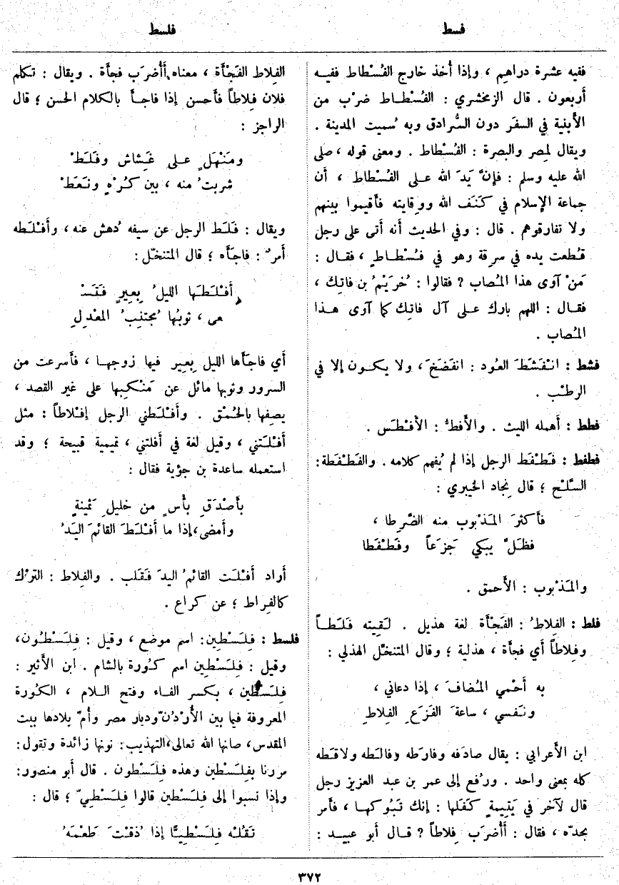 فلسط: فِلَسْطِين: اسْمُ مَوْضِعٍ، وَقِيلَ: فِلَسْطُون، وَقِيلَ: فِلَسْطِين اسْمُ كُورة بِالشَّامِ. ابْنُ الأَثير: فِلَسْطين، بِكَسْرِ الْفَاءِ وَفَتْحِ اللَّامِ، الكُورة الْمَعْرُوفَةُ فيما بين الأُرْدُنّ وديار مِصْرَ وأُمّ بِلَادِهَا بَيْتُ الْمَقْدِسِ، صَانَهَا اللَّهُ تَعَالَى، التَّهْذِيبُ: نُونُهَا زَائِدَةٌ وَتَقُولُ: مَرَرْنَا بفِلَسْطين وَهَذِهِ فِلَسْطون. قَالَ أَبو مَنْصُورٍ: وإِذا نَسَبُوا إِلى فِلَسْطين قَالُوا فِلَسْطِيّ؛ قَالَ: