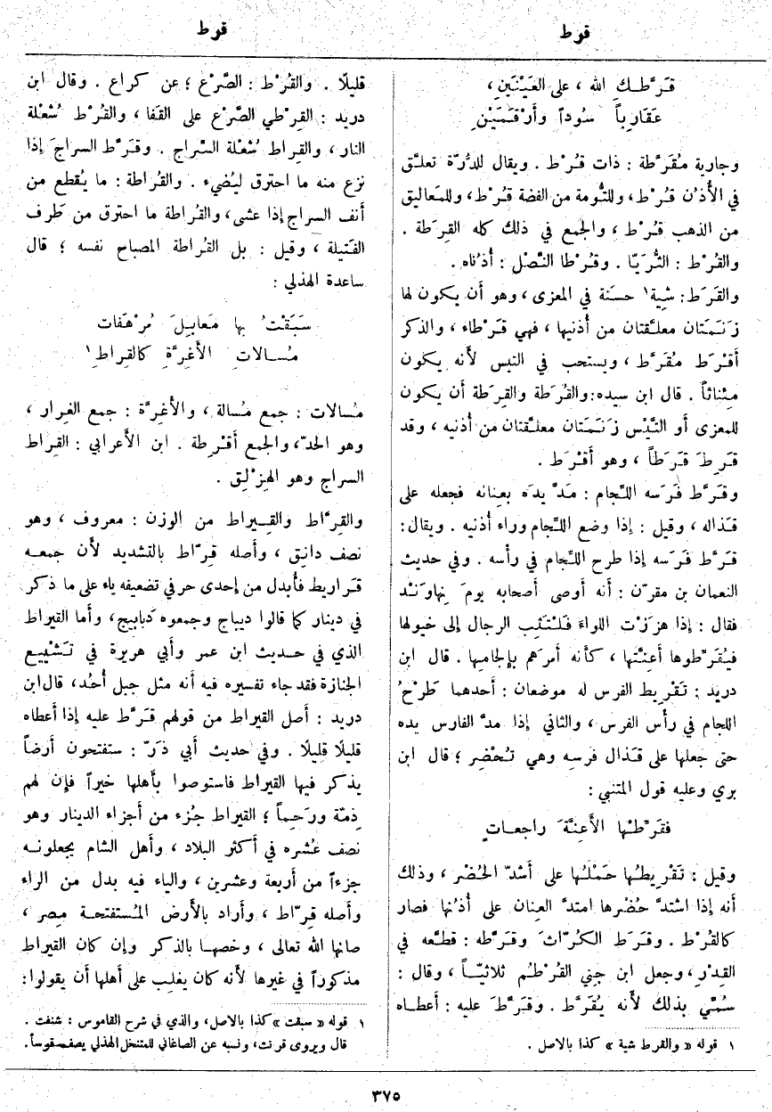 وَقِيلَ: تَقْرِيطُها حَمْلُها على أَشدّ الخُضْر، وَذَلِكَ أَنه إِذا اشتدَّ حُضْرها امتدَّ العِنان عَلَى أُذُنها فَصَارَ كالقُرْط. وقَرَط الكُرّاثَ وقَرَّطه: قطَّعه فِي القِدْرِ، وَجَعَلَ ابْنُ جِني القُرْطُم ثُلَاثِيًّا، وَقَالَ: سُمِّي بِذَلِكَ لأَنه يُقَرَّط. وقَرَّطَ عَلَيْهِ: أَعطاه قَلِيلًا. والقُرْط: الصَّرْع؛ عَنْ كُرَاعٍ. وَقَالَ ابْنُ دُرَيْدٍ: القِرْطي الصَّرْع عَلَى القَفا، والقُرْط شُعْلة النار، والقِرط شُعْلة السِّراج. وقَرَّط السراجَ إِذا نَزَعَ مِنْهُ مَا احْتَرَقَ ليُضيء. والقُراطة: مَا يُقطع مِنْ أَنف السِّرَاجِ إِذا عَشَّى، والقُراطة مَا احْتَرَقَ مِنْ طَرف الفَتيلة، وَقِيلَ: بَلِ القُراطة الْمِصْبَاحُ نَفْسُهُ؛ قَالَ سَاعِدَةُ الْهُذَلِيُّ: