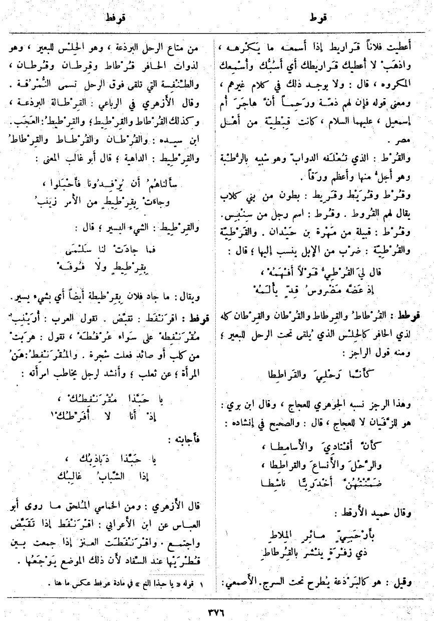 قرطط: القُرْطاطُ والقِرطاط والقُرْطان والقِرْطان كُلُّهُ لِذِي الْحَافِرِ كالحِلْس الَّذِي يُلقى تَحْتَ الرَّحْلِ لِلْبَعِيرِ؛ وَمِنْهُ قَوْلُ الرَّاجِزِ: