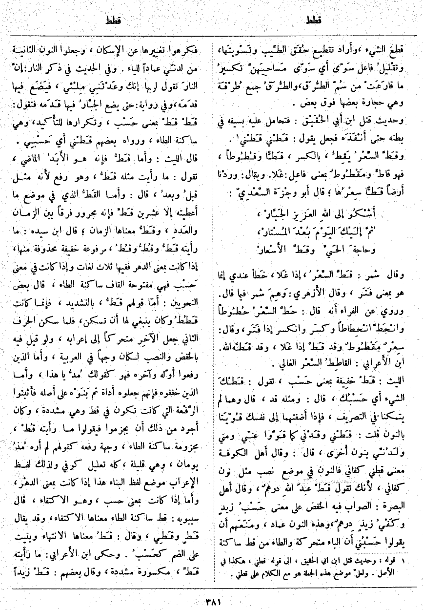 بِمَعْنَى حَسْب، وَتَكْرَارُهَا للتأْكيد، وَهِيَ سَاكِنَةُ الطَّاءِ، وَرَوَاهُ بَعْضُهُمْ قَطْني أَي حَسْبِي. قَالَ اللَّيْثُ: وأَما قَطُّ فإِنه هُوَ الأَبَدُ الْمَاضِي، تَقُولُ: مَا رأَيت مِثْلَهُ قَطُّ، وَهُوَ رَفْعٌ لأَنه مِثْلُ قبلُ وبعدُ، قَالَ: وأَما القَطُّ الَّذِي فِي مَوْضِعِ مَا أَعطيته إِلا عِشْرِينَ قَطِّ فإِنه مَجْرُورٌ فَرْقًا بَيْنَ الزَّمَانِ والعَددِ، وقَطُّ مَعْنَاهَا الزَّمَانُ؛ قَالَ ابْنُ سِيدَهْ: مَا رأَيته قَطُّ وقُطُّ وقُطُ، مَرْفُوعَةٌ خَفِيفَةٌ مَحْذُوفَةٌ مِنْهَا، إِذا كَانَتْ بِمَعْنَى الدَّهْرِ فَفِيهَا ثَلَاثُ لُغَاتٍ وإِذا كَانَتْ فِي مَعْنَى حَسْب فَهِيَ مَفْتُوحَةُ الْقَافِ سَاكِنَةُ الطَّاءِ، قَالَ بَعْضُ النَّحْوِيِّينَ: أَمّا قَوْلُهُمْ قَطُّ، بِالتَّشْدِيدِ، فإِنما كَانَتْ قَطُطُ وَكَانَ يَنْبَغِي لَهَا أَن تُسَكَّنَ، فَلَمَّا سَكَنَ الْحَرْفُ الثَّانِي جُعِلَ الآخِر مُتَحَرِّكًا إِلى إِعرابه، وَلَوْ قِيلَ فِيهِ بِالْخَفْضِ وَالنَّصْبِ لَكَانَ وَجْهًا فِي الْعَرَبِيَّةِ، وأَما الَّذِينَ رَفَعُوا أَوَّله وَآخِرَهُ فَهُوَ كَقَوْلِكَ مُدُّ يَا هَذَا، وأَما الَّذِينَ خَفَّفُوهُ فإِنهم جَعَلُوهُ أَداة ثُمَّ بَنَوْه عَلَى أَصله فأَثبتوا الرَّفْعة الَّتِي كَانَتْ تَكُونُ فِي قَطُّ وَهِيَ مُشَدَّدَةٌ، وَكَانَ أَجود مِنْ ذَلِكَ أَن يَجْزِمُوا فَيَقُولُوا مَا رأَيته قُطْ، مَجْزُومَةٌ سَاكِنَةُ الطَّاءِ، وَجِهَةُ رَفْعِهِ كَقَوْلِهِمْ لَمْ أَره مُذُ يَوْمَانِ، وَهِيَ قَلِيلَةٌ، كُلُّهُ تَعْلِيلٌ كُوفِيٌّ وَلِذَلِكَ لَفْظُ الإِعراب مَوْضِعُ لَفْظِ الْبِنَاءِ هَذَا إِذا كَانَتْ بِمَعْنَى الدهْر، وأَما إِذا كَانَتْ بِمَعْنَى حَسْبُ، وَهُوَ الِاكْتِفَاءُ، قَالَ سِيبَوَيْهِ: قَطْ سَاكِنَةُ الطَّاءِ مَعْنَاهَا الِاكْتِفَاءُ، وَقَدْ يُقَالُ قَطٍ وقَطِي، وَقَالَ: قَطُ مَعْنَاهَا الِانْتِهَاءُ وَبُنِيَتْ عَلَى الضَّمِّ كحَسْبُ. وَحَكَى ابْنُ الأَعرابي: مَا رأَيته قَطِّ، مَكْسُورَةً مُشَدَّدَةً، وَقَالَ بعضهم: قَطْ زيداً