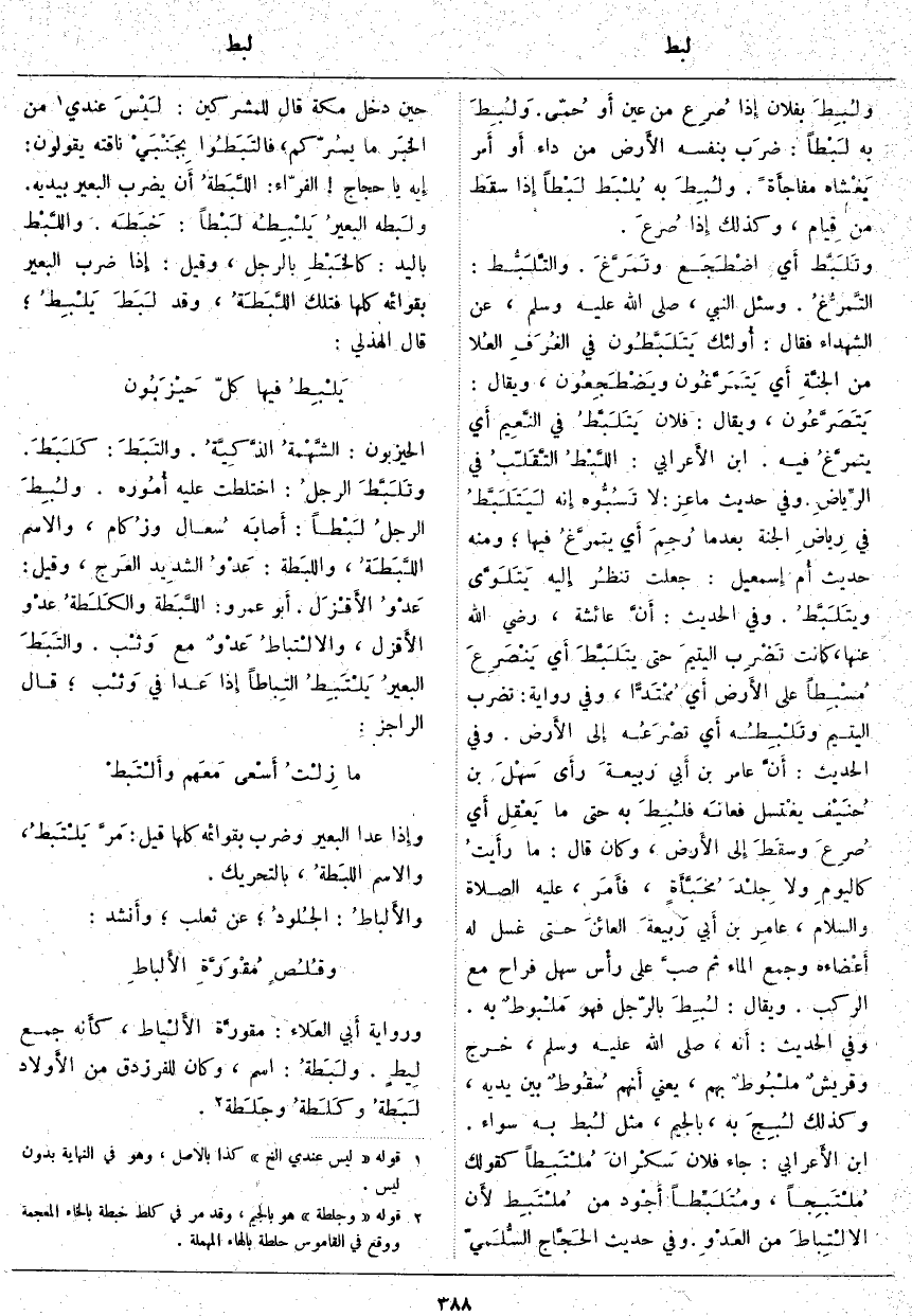 ولُبِطَ بِفُلَانٍ إِذا صُرِع مِنْ عَيْنٍ أَو حُمّى. وَلُبِطَ بِهِ لَبْطاً: ضرَب بِنَفْسِهِ الأَرض مِنْ دَاءٍ أَو أَمر يَغْشاه مفاجأَةً. ولُبِطَ بِهِ يُلْبَط لَبْطاً إِذا سقَط مِنْ قِيام، وَكَذَلِكَ إِذا صُرعَ. وتَلَبَّط أَي اضْطَجَع وتَمَرَّغَ. والتَّلَبُّط: التَّمرُّغُ.