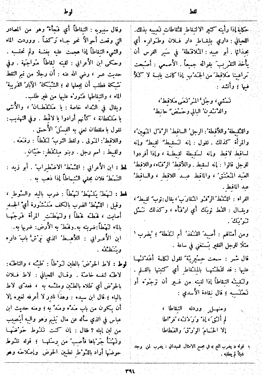 واللَّقِيطةُ واللَّاقِطةُ: الرجلُ الساقِطُ الرَّذْل المَهِينُ، والمرأَة كَذَلِكَ. تَقُولُ: إِنه لَسقِيطٌ لقِيطٌ وإِنه لساقِط لاقِط وإِنه لسَقِيطة لقِيطة، وإِذا أَفردوا لِلرَّجُلِ قَالُوا: إِنه لَسَقِيطٌ. واللَّاقِطُ الرَّفّاء، واللاقِطُ العَبد المُعْتَقُ، والماقِط عَبْدُ اللاقِطِ، والساقِطُ عَبَدُ الماقِطِ. الْفَرَّاءُ: اللَّقْطُ الرَّفْو المُقارَبُ، يُقَالُ: ثوبٌ لقِيطٌ، وَيُقَالُ: القُط ثوبَك أَي ارْفَأْه، وَكَذَلِكَ نَمِّل ثَوْبَكَ. وَمِنْ أَمثالهم: أَصِيدَ القُنْفذُ أَم لُقَطةٌ؛ يُضرب «4» مَثُلًا لِلرَّجُلِ الْفَقِيرِ يَستغني فِي سَاعَةٍ. قَالَ شَمِرٌ: سَمِعْتُ حِمْيرِيّةً تَقُولُ لِكَلِمَةٍ أَعَدْتُها عَلَيْهَا: قَدْ لقَطْتها بالمِلْقاطِ أَي كَتَبْتُهَا بِالْقَلَمِ. ولَقِيتُه التِقاطاً إِذا لَقِيتَهُ مِنْ غَيْرِ أَن ترجُوَه أَو تَحْتَسِبه؛ قَالَ نِقادة الأَسدي: