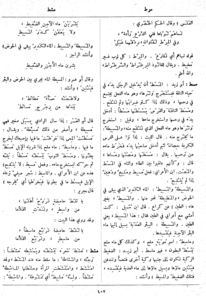 مسط: أَبو زَيْدٍ: المَسْطُ أَن يُدخِل الرجُل يدَه فِي حَياء النَّاقَةِ فيسْتَخْرج وَثْرها، وَهُوَ مَاءُ الْفَحْلِ يَجْتَمِعُ فِي رَحِمِهَا، وَذَلِكَ إِذا كَثُرَ ضِرابُها وَلَمْ تَلْقَح. ومَسَطَ الناقَةَ والفَرَسَ يَمْسُطُها مَسْطاً: أَدخل يدَه فِي رَحِمِهَا وَاسْتَخْرَجَ مَاءَهَا، وَقِيلَ: اسْتَخْرَجَ وَثْرَها وَهُوَ مَاءُ الْفَحْلِ الَّذِي تَلْقَح مِنْهُ، والمَسِيطةُ: مَا يُخْرج مِنْهُ. قَالَ اللَّيْثُ: إِذا نَزَا عَلَى الْفَرَسِ الْكَرِيمَةِ حِصانٌ لَئِيمٌ أَدخل صاحبُها يدَه فَخَرَط مَاءَهُ مِنْ رَحمِها. يُقَالُ: مَسَطَها ومَصَتَها ومَساها، قَالَ: وكأَنهم عَاقَبُوا بَيْنَ الطَّاءِ وَالتَّاءِ فِي المَسْط والمَصْت. ابْنُ الأَعرابي: فَحْلٌ مَسِيط ومَلِيخٌ ودَهِينٌ إِذا لَمْ يُلْقِح. والمَسِيطةُ والمَسِيطُ: الْمَاءُ الكَدِرُ الَّذِي يَبْقَى فِي الْحَوْضِ، والمَطِيطةُ نَحْوٌ مِنْهَا. والمَسِيطُ، بِغَيْرِ هَاءٍ: الطِّينُ؛ عَنْ كُرَاعٍ. قَالَ ابْنُ شُميل: كُنْتُ أَمشي مَعَ أَعرابي فِي الطِّينِ فَقَالَ: هَذَا المَسِيط، يَعْنِي الطِّينَ. والمَسِيطة: البِئر العَذْبةُ يَسِيلُ إِليها مَاءُ الْبِئْرِ الآجِنةِ فيُفْسِدها. وماسِطٌ: اسْمُ مُوَيْهٍ مِلْحٍ، وَكَذَلِكَ كُلُّ مَاءٍ مِلْحٍ يَمْسُطُ الْبُطُونَ، فَهُوَ مَاسِطٌ. أَبو زَيْدٍ: الضَّغِيطُ الرَّكِيَّةُ تَكُونُ إِلى جَنْبِهَا رَكِيَّةٌ أُخرى فتحمأُ وَتَنْدَفِنُ فيُنْتِن مَاؤُهَا وَيَسِيلُ مَاؤُهَا إِلى مَاءِ الْعَذْبَةِ فيُفْسِده، فَتِلْكَ الضغِيطُ وَالْمَسِيطُ؛ وأَنشد: