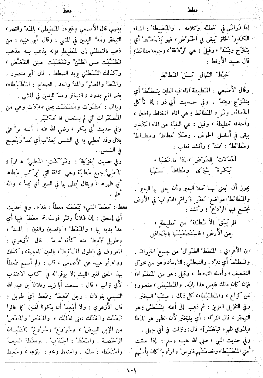 يَجُوزُ أَن يُعنى بِهَا صَلا الْبَعِيرِ وأَن يُعْنَى بِهَا الْبَعِيرُ. والمَطائطُ: مواضعُ حَفْرِ قَوائمِ الدّوابِّ فِي الأَرض تَجْتَمِعُ فِيهَا الرِّداغُ؛ وأَنشد: