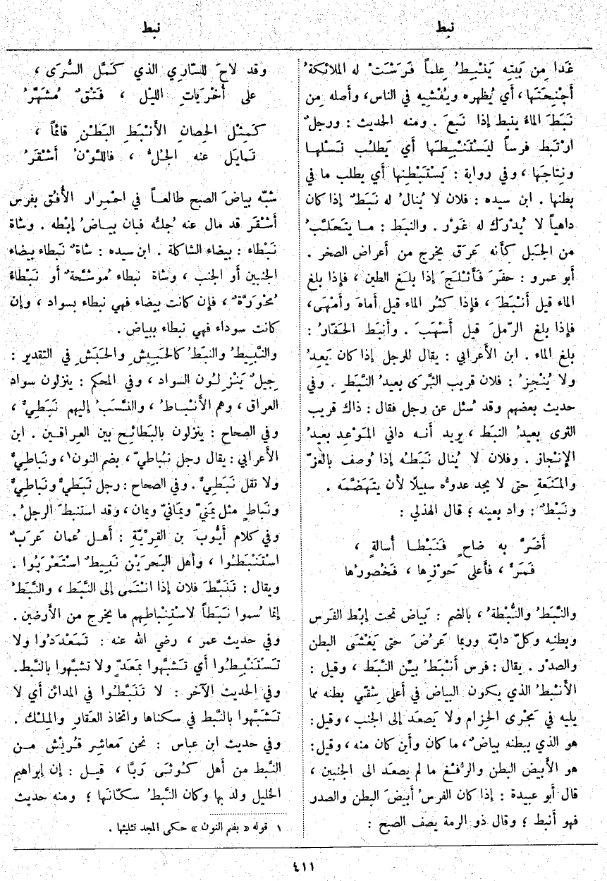 شَبَّهَ بياضَ الصُّبْحِ طَالِعًا فِي احْمِرار الأُفُق بِفَرَسٍ أَشْقَر قَدْ مَالَ عَنْهُ جُلُّه فَبَانَ بياضُ إِبْطه. وَشَاةٌ نَبْطاء: بَيْضَاءُ الشَّاكِلَةِ. ابْنُ سِيدَهْ: شاةٌ نَبطاء بَيْضَاءُ الْجَنْبَيْنِ أَو الْجَنْبِ، وَشَاةٌ نَبْطَاءُ مُوشَّحةٌ أَو نَبْطاءُ مُحْوَرَّةٌ، فإِن كَانَتْ بَيْضَاءَ فَهِيَ نَبْطَاءُ بِسَوَادٍ، وإِن كَانَتْ سَوْدَاءَ فَهِيَ نَبْطَاءُ بِبَيَاضٍ. والنَّبِيطُ والنبَطُ كالحَبِيشِ والحَبَشِ فِي التَّقْدِيرِ: جِيلٌ يَنْزِلُون السَّوَادَ، وَفِي الْمُحْكَمِ: يَنْزِلُونَ سَوَادَ الْعِرَاقِ، وَهُمُ الأَنْباطُ، والنَّسَبُ إِليهم نَبَطِيٌّ، وَفِي الصِّحَاحِ: يَنْزِلُونَ بالبَطائِح بَيْنَ العِراقين. ابْنُ الأَعرابي: يُقَالُ رَجُلٌ نُباطيّ، بِضَمِّ النُّونِ «1»، ونَباطِيٌّ وَلَا تَقُلْ نَبَطِيٌّ. وَفِي الصِّحَاحِ: رَجُلٌ نَبَطيٌّ ونَباطِيٌّ ونَباطٍ مِثْلُ يَمنيّ ويمَانيّ وَيَمَانٍ، وَقَدِ استنبطَ الرجلُ. وَفِي كَلَامِ أَيُّوبَ بْنِ القِرِّيّةِ: أَهل عُمان عَرَبٌ اسْتَنْبَطُوا، وأَهل البَحْرَيْن نَبِيطٌ اسْتَعْرَبُوا. وَيُقَالُ: تَنَبَّطَ فُلَانٌ إِذا انْتَمى إِلى النَّبَط، والنَّبَطُ إِنما سُموا نَبَطاً لاسْتِنْباطِهم مَا يَخْرُجُ مِنَ الأَرضين. وَفِي حَدِيثِ