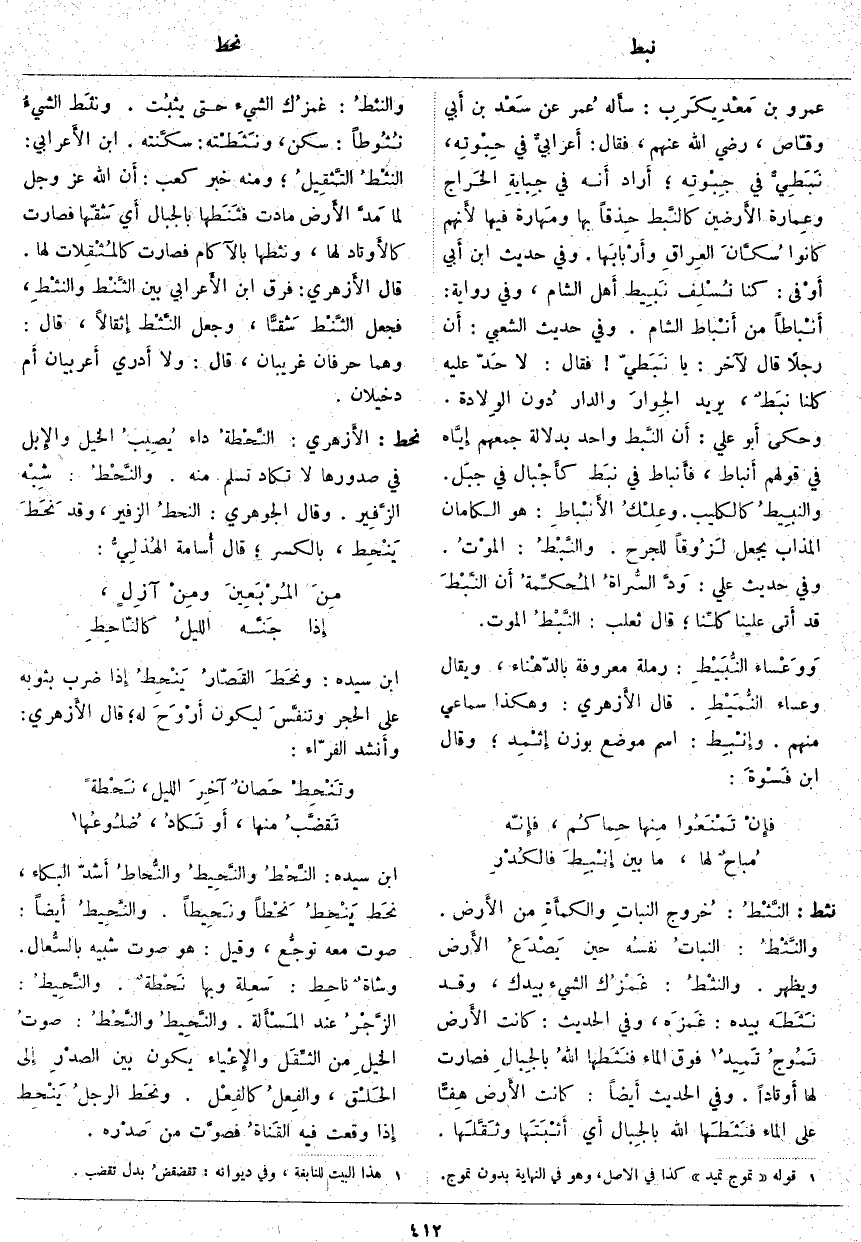 يُرِيدُ الجِوارَ وَالدَّارَ دُون الوِلادة. وَحَكَى أَبو عَلِيٍّ: أَن النَّبط وَاحِدٌ بِدَلَالَةِ جَمْعِهِمْ إِيَّاه فِي قَوْلِهِمْ أَنباط، فأَنباط فِي نَبَط كأَجْبال فِي جبَل. والنبِيطُ كَالْكَلِيبِ. وعِلْكُ الأَنْباطِ: هُوَ الْكَامَّانُ الْمُذَابُ يُجْعَلُ لَزُوقاً لِلْجُرْحِ. والنَّبْطُ: الموْتُ. وَفِي حَدِيثِ