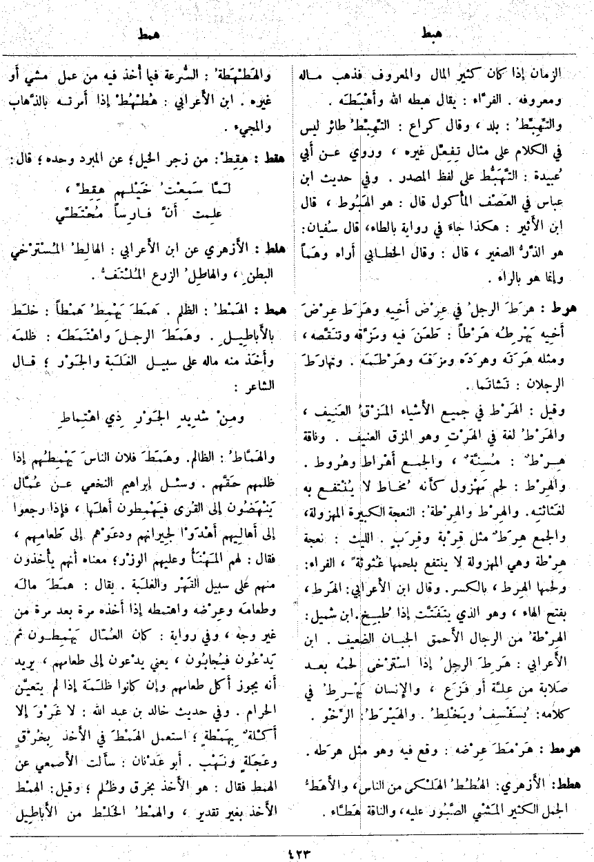 هطط: الأَزهري: الهُطُطُ الهَلْكى مِنَ النَّاسِ، والأَهَطُّ الْجَمَلُ الْكَثِيرُ المَشْي الصَّبُور عَلَيْهِ، وَالنَّاقَةُ هَطَّاء. والهَطْهَطةُ: السُّرعة فِيمَا أُخذ فِيهِ مِنَ عَمَلِ مَشْيٍ أَو غَيْرِهِ. ابْنُ الأَعرابي: هُطْهُطْ إِذا أَمرته بالذَّهاب والمجيء.