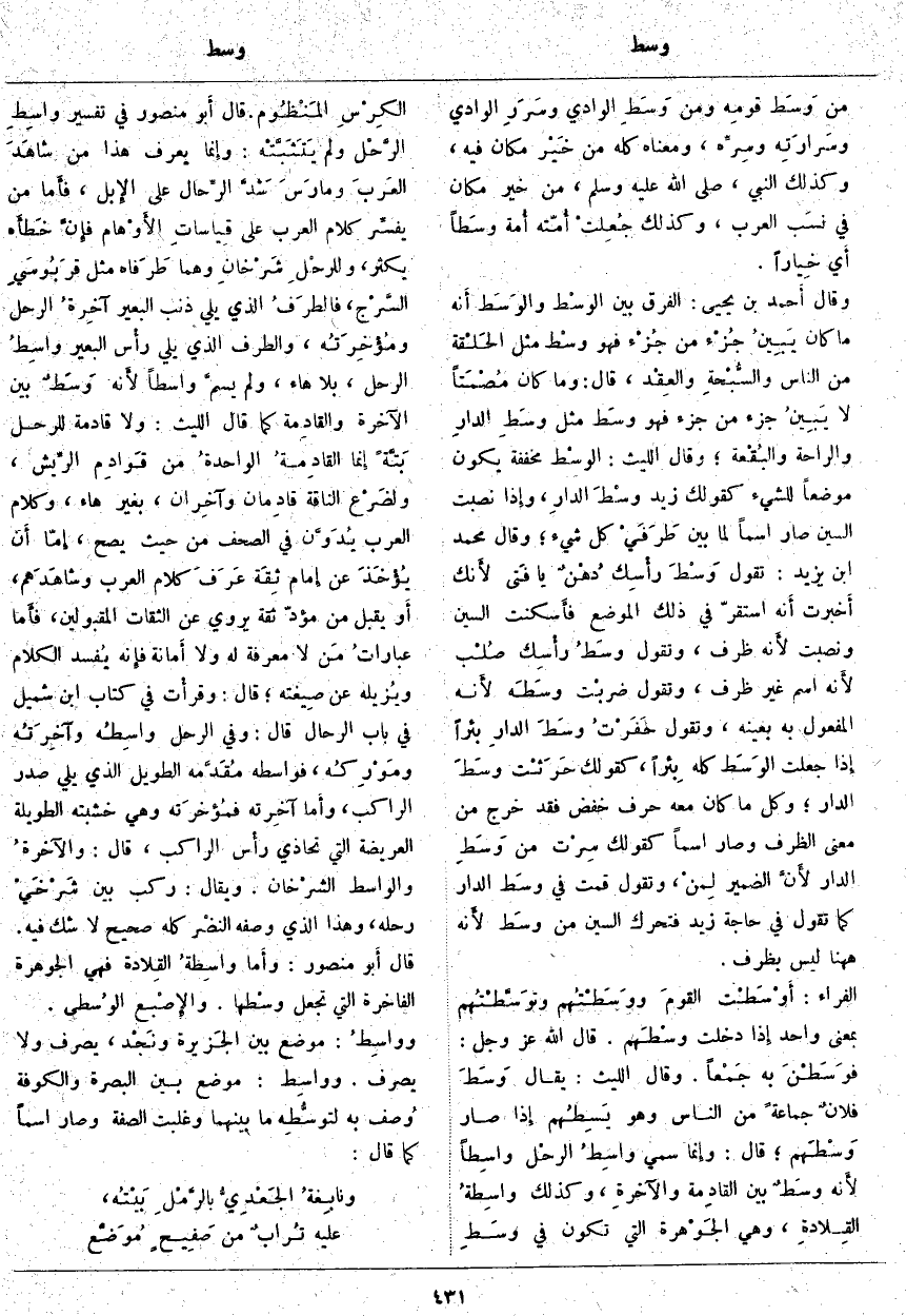 . وَقَالَ اللَّيْثُ: يُقَالُ وَسَطَ فلانٌ جَمَاعَةً مِنَ النَّاسِ وَهُوَ يَسِطُهم إِذا صَارَ وَسْطَهم؛ قَالَ: وإِنما سُمِّيَ واسِطُ الرحْل واسِطاً لأَنه وسَطٌ بَيْنَ القادِمة والآخرةِ، وَكَذَلِكَ واسِطةُ القِلادةِ، وَهِيَ الجَوْهرة الَّتِي تَكُونُ فِي وسَطِ الكِرْسِ المَنْظُوم. قَالَ أَبو مَنْصُورٍ فِي تَفْسِيرِ واسِطِ الرَّحْل وَلَمْ يَتَثَبَّتْه: وإِنما يَعْرِفُ هَذَا مِنْ شاهَدَ العَربَ ومارَسَ شَدَّ الرِّحال عَلَى الإِبل، فأَما مَنْ يفسِّر كَلَامَ الْعَرَبِ عَلَى قِياساتِ الأَوْهام فإِنَّ خَطأَه يَكْثُرُ، وللرحْلِ شَرْخانِ وَهُمَا طَرَفاه مِثْلُ قرَبُوسَيِ السَّرْج، فالطرَفُ الَّذِي يَلِي ذَنَبَ الْبَعِيرِ آخِرةُ الرَّحْلِ ومُؤْخِرَتُه، وَالطَّرَفُ الَّذِي يَلِي رأْس الْبَعِيرِ واسِطُ الرَّحْلِ، بِلَا هَاءٍ، وَلَمْ يسمَّ وَاسِطًا لأَنه وَسَطٌ بَيْنَ الْآخِرَةِ والقادِمة كَمَا قَالَ اللَّيْثُ: وَلَا قَادِمَةَ لِلرَّحْلِ بَتَّةً إِنما القادمةُ الواحدةُ مِنْ قَوادِم الرِّيش، ولضَرْع النَّاقَةِ قادِمان وآخِران، بِغَيْرِ هَاءٍ، وَكَلَامِ الْعَرَبِ يُدَوَّن فِي الصُّحُفِ مِنْ حَيْثُ يَصِحُّ، إِمّا أَن يُؤْخَذَ عَنْ إِمام ثِقَة عَرَفَ كَلَامَ الْعَرَبِ وشاهَدَهم، أَو يَقْبَلُ مِنْ مُؤَدٍّ ثِقَةٍ يَرْوِي عَنِ الثِّقَاتِ الْمَقْبُولِينَ، فأَما عباراتُ مَن لَا مَعْرِفَةَ لَهُ وَلَا أَمانة فإِنه يُفسد الْكَلَامَ ويُزيله عَنْ صِيغته؛ قَالَ: وقرأْت فِي كِتَابِ ابْنُ شُمَيْلٍ فِي بَابِ الرحال قَالَ: وَفِي الرَّحْلِ واسِطُه وآخِرَتُه ومَوْرِكُه، فَوَاسِطُهُ مُقَدَّمه الطَّوِيلُ الَّذِي يَلِي صَدْرَ الرَّاكِبِ، وأَما آخِرته فمُؤخرَته وَهِيَ خَشَبَتُهُ الطَّوِيلَةُ الْعَرِيضَةُ الَّتِي تُحَاذِي رأْس الرَّاكِبِ، قَالَ: والآخرةُ وَالْوَاسِطُ الشرْخان. وَيُقَالُ: رَكِبَ بَيْنَ شَرْخَيْ رَحْلِهِ، وَهَذَا الَّذِي وَصَفَهُ النضْر كُلُّهُ صَحِيحٌ لَا شَكَّ فِيهِ. قَالَ أَبو مَنْصُورٍ: وأَما واسِطةُ القِلادة فَهِيَ الْجَوْهَرَةُ الْفَاخِرَةُ الَّتِي تُجْعَلُ وسْطها. والإِصْبع الوُسطى. وواسِطُ: مَوْضِعٌ بَيْنَ الجَزيرة ونَجْد، يُصْرَفُ وَلَا يُصْرَفُ. وواسِط: مَوْضِعٌ بَيْنَ الْبَصْرَةِ وَالْكُوفَةِ وُصف بِهِ لتوسُّطِه مَا بَيْنَهُمَا وَغَلَبَتِ الصِّفَةُ وَصَارَ اسْمًا كَمَا قَالَ:
