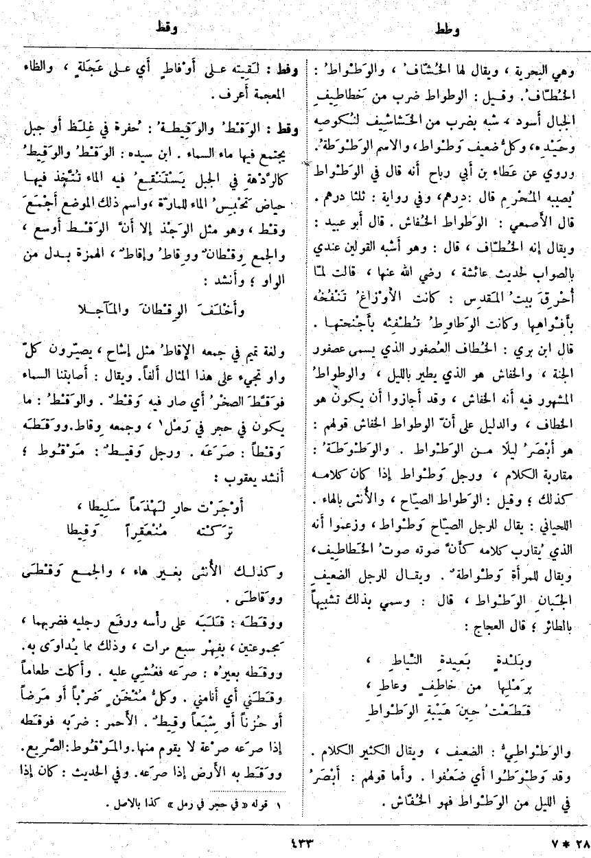 وَلُغَةُ تَمِيمٍ فِي جَمْعِهِ الإِقاطُ مِثْلَ إِشاح، يُصَيِّرُونَ كُلَّ وَاوٍ تَجِيءُ عَلَى هَذَا الْمِثَالِ أَلفاً. وَيُقَالُ: أَصابتنا السَّمَاءُ فوَقَّطَ الصخْرُ أَي صَارَ فِيهِ وَقْطٌ. والوَقْطُ: مَا يَكُونُ فِي حَجَرٍ فِي رَمْل «3»، وَجَمْعُهُ وِقاط. ووقَطَه وَقْطاً: صَرَعَه. وَرَجُلٌ وَقيطٌ: مَوْقُوط؛ أَنشد يَعْقُوبُ: