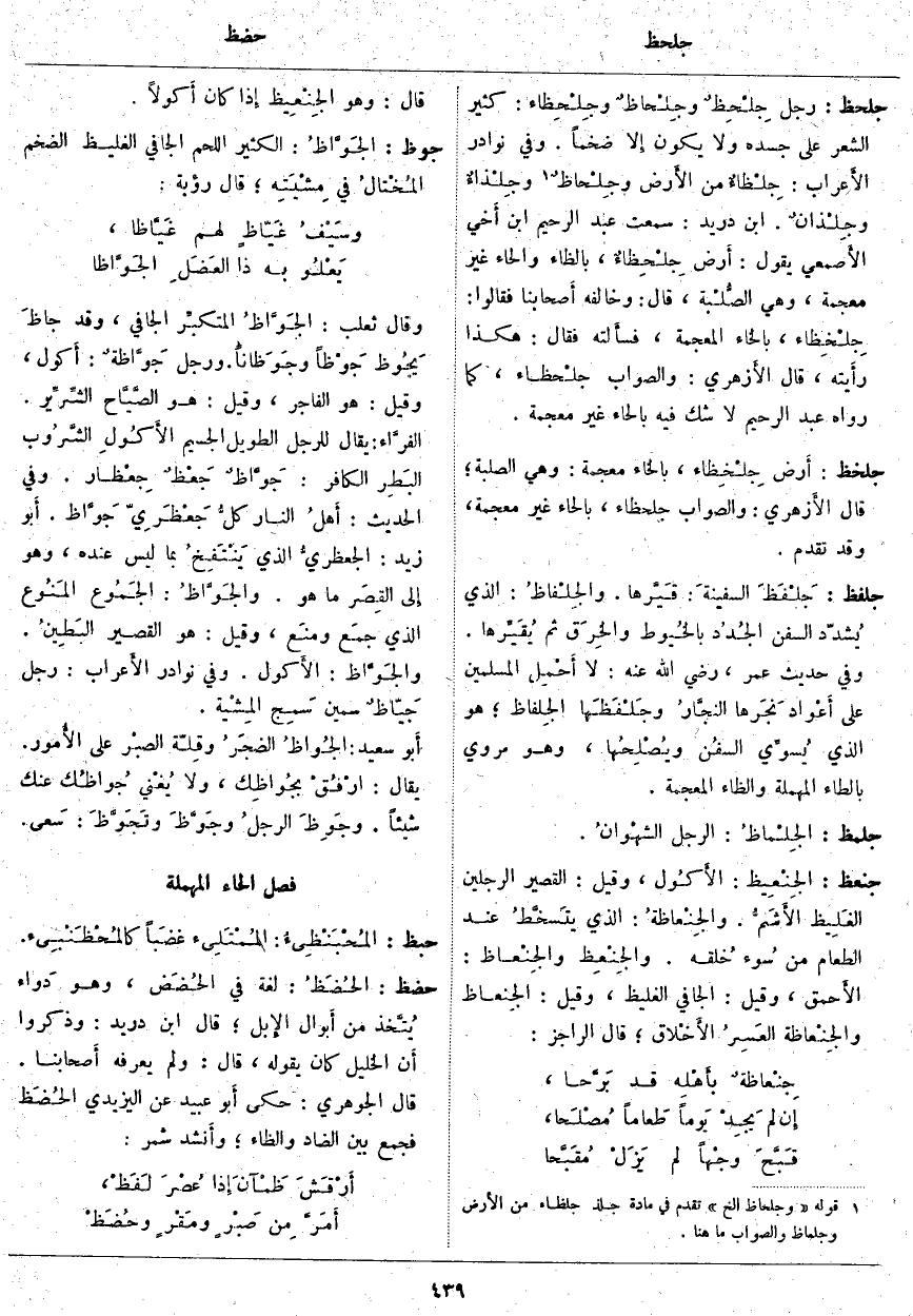 جَلْحَظَ: رَجُلٌ جِلْحِظٌ وجِلْحاظٌ وجِلْحِظاء: كَثِيرُ الشَّعْرِ عَلَى جَسَدِهِ وَلَا يَكُونُ إِلا ضَخْمًا. وَفِي نَوَادِرِ الأَعراب: جِلْظاءٌ مِنَ الأَرض وجِلْحاظٌ»