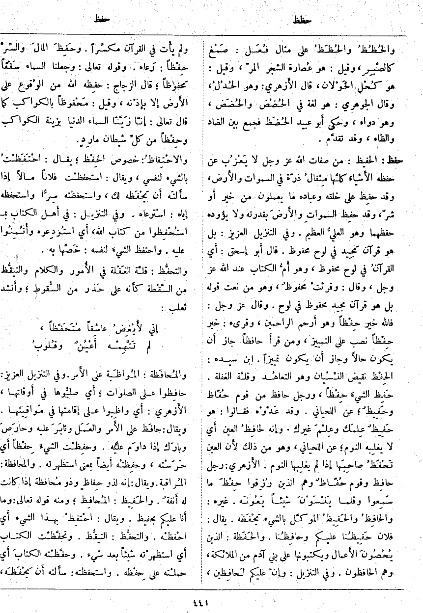 ، وَلَمْ يأْت فِي الْقُرْآنِ مكسَّراً. وحَفِظَ المالَ والسِّرَّ حِفْظاً: رَعاه. وَقَوْلُهُ تَعَالَى: وَجَعَلْنَا السَّماءَ سَقْفاً مَحْفُوظاً