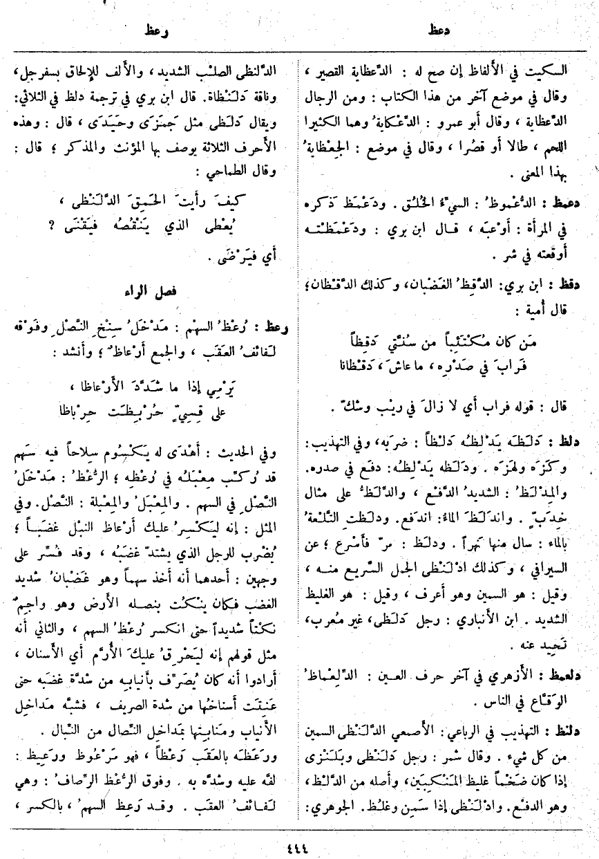 دلظ: دَلَظَه يَدْلِظُه دَلْظاً: ضرَبه، وَفِي التَّهْذِيبِ: وكَزَه ولَهَزه. ودَلَظه يَدْلِظُه: دفَع فِي صَدْرِهِ. والمِدْلَظُ: الشديدُ الدَّفْع، والدِّلَظُّ عَلَى مِثَالِ خِدَبٍّ. واندَلَظَ الماءُ: اندَفع. ودلَظتِ التَّلْعةُ بِالْمَاءِ: سَالَ مِنْهَا نَهراً. ودلَظ: مَرَّ فأَسْرع؛ عَنِ السِّيرَافِيِّ، وَكَذَلِكَ ادْلَنْظى الْجَمَلُ السَّريع مِنْهُ، وَقِيلَ: هُوَ السَّمِينُ وَهُوَ أَعرف، وَقِيلَ: هُوَ الْغَلِيظُ الشَّدِيدُ. ابْنُ الأَنباري: رَجُلٌ دَلَظى، غَيْرُ مُعرب، تَحِيد عنه.