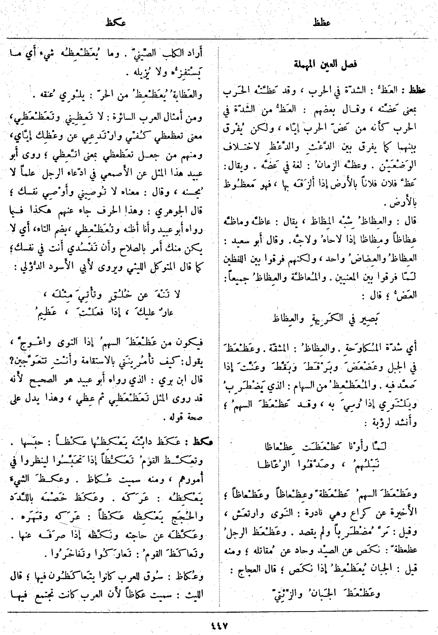 عظظ: العَظُّ: الشِّدَّةُ فِي الْحَرْبِ، وَقَدْ عَظَّتْه الحَرب بِمَعْنَى عَضَّته، وَقَالَ بَعْضُهُمُ: العَظُّ مِنَ الشِّدَّةِ فِي الْحَرْبِ كأَنه مِنْ عَضّ الْحَرْبِ إِيّاه، وَلَكِنْ يُفْرق بَيْنَهُمَا كَمَا يُفَرَّقُ بَيْنَ الدَّعْثِ والدَّعْظِ لِاخْتِلَافِ الوَضْعَيْن. وعظَّه الزمانُ: لُغَةٌ فِي عضَّه. وَيُقَالُ: عَظَّ فُلَانٌ فُلَانًا بالأَرض إِذا أَلزَقَه بِهَا، فَهُوَ مَعظُوظ بالأَرض. قَالَ: والعِظاظُ شِبْه المِظاظ، يُقَالُ: عاظَّه وماظَّه عِظاظاً ومِظاظاً إِذا لاحاهُ ولاجَّه. وَقَالَ أَبو سَعِيدٍ: العِظاظُ والعِضاضُ وَاحِدٌ، وَلَكِنَّهُمْ فَرَّقُوا بَيْنَ اللَّفْظَيْنِ لَمّا فَرَقُوا بَيْنَ الْمَعْنَيَيْنِ. والمُعاظَّة والعِظاظُ جَمِيعًا: العَضُّ؛ قَالَ: