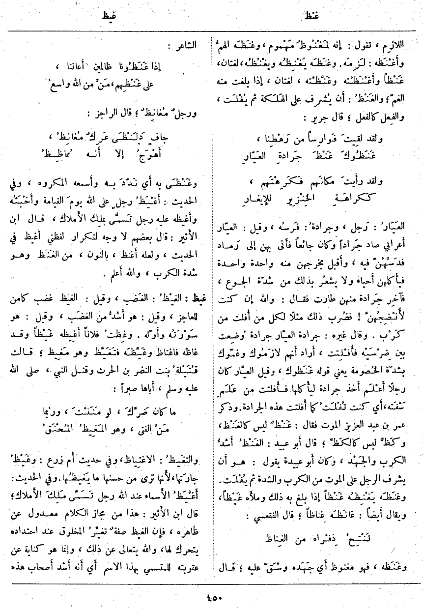 غيظ: الغيْظُ: الغَضب، وَقِيلَ: الْغَيْظُ غَضَبٌ كَامِنٌ لِلْعَاجِزِ، وَقِيلَ: هُوَ أَشدُّ مِنَ الغضَب، وَقِيلَ: هُوَ سَوْرَتُه وأَوّله. وغِظتُ فُلَانًا أَغِيظه غَيْظاً وَقَدْ غَاظَهُ فَاغْتَاظَ وغَيَّظَه فتَغَيَّظ وَهُوَ مَغِيظ؛ قَالَتْ قُتَيْلةُ بِنْتُ النَّضْرِ بْنِ الحرث وَقَتَلَ النَّبِيُّ، صَلَّى اللَّهُ عَلَيْهِ وَسَلَّمَ، أَباها صَبْرًا: