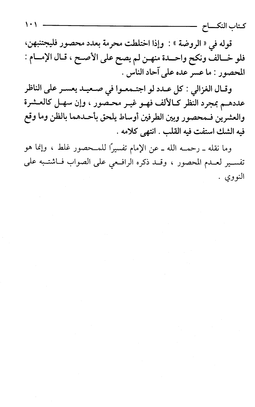 وما نقله -رحمه الله- عن الإمام تفسيرًا للمحصور غلط، وإنما هو تفسير لعدم المحصور، وقد ذكره الرافعي على الصواب فاشتبه على النووي.