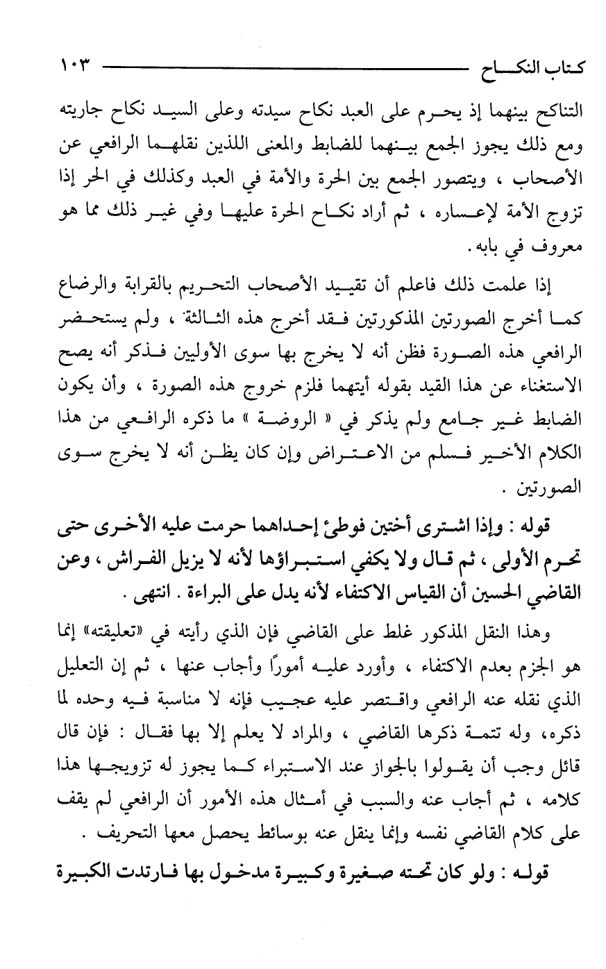 التناكح بينهما إذ يحرم على العبد نكاح سيدته وعلى السيد نكاح جاريته ومع ذلك يجوز الجمع بينهما للضابط والمعنى اللذين نقلهما الرافعي عن الأصحاب، ويتصور الجمع بين الحرة والأمة في العبد وكذلك في الحر إذا تزوج الأمة لإعساره، ثم أراد نكاح الحرة عليها وفي غير ذلك مما هو معروف في بابه.