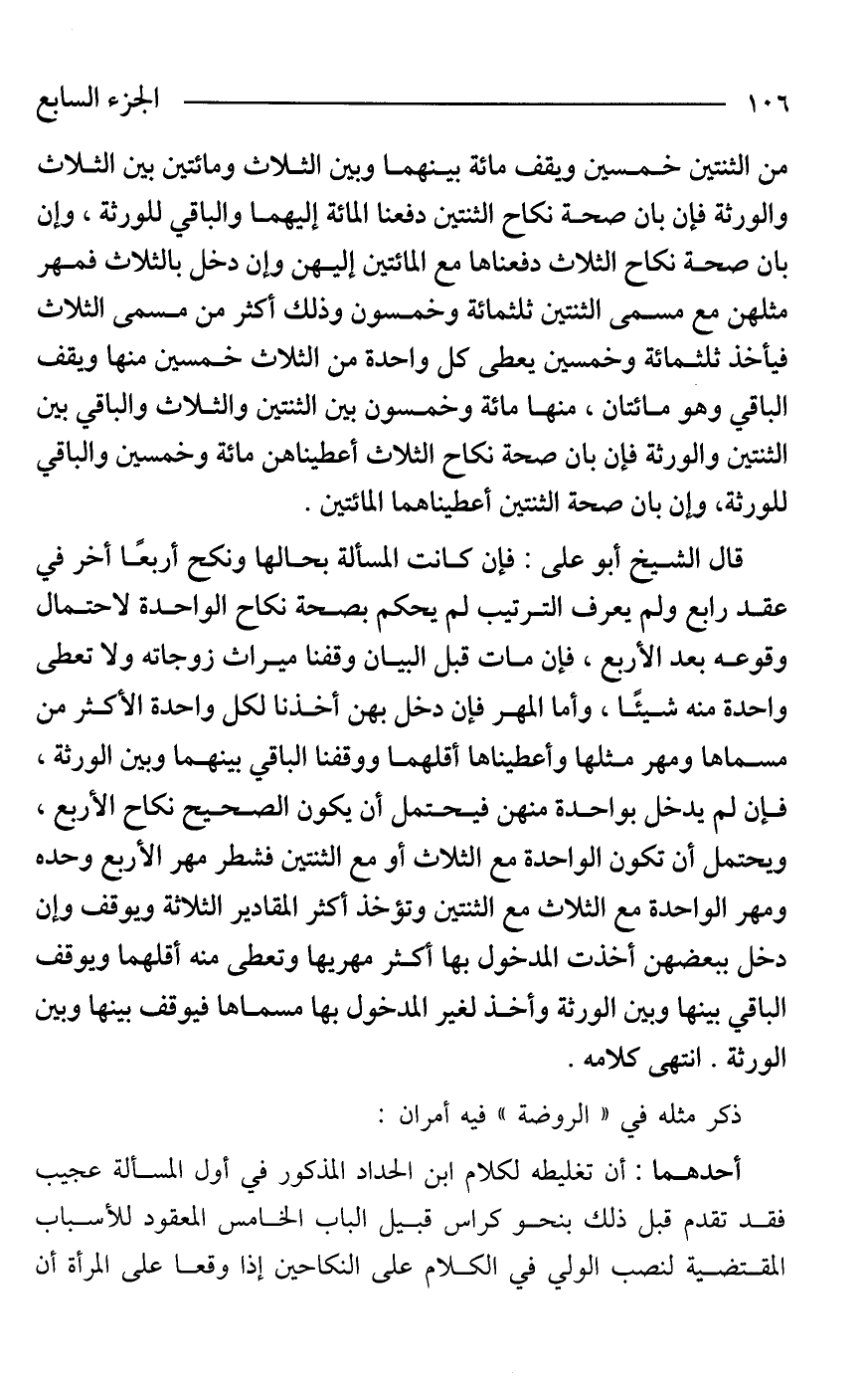 أحدهما: أن تغليطه لكلام ابن الحداد المذكور في أول المسألة عجيب فقد تقدم قبل ذلك بنحو كراس قبيل الباب الخامس المعقود للأسباب المقتضية لنصب الولي في الكلام على النكاحين إذا وقعا على المرأة أن