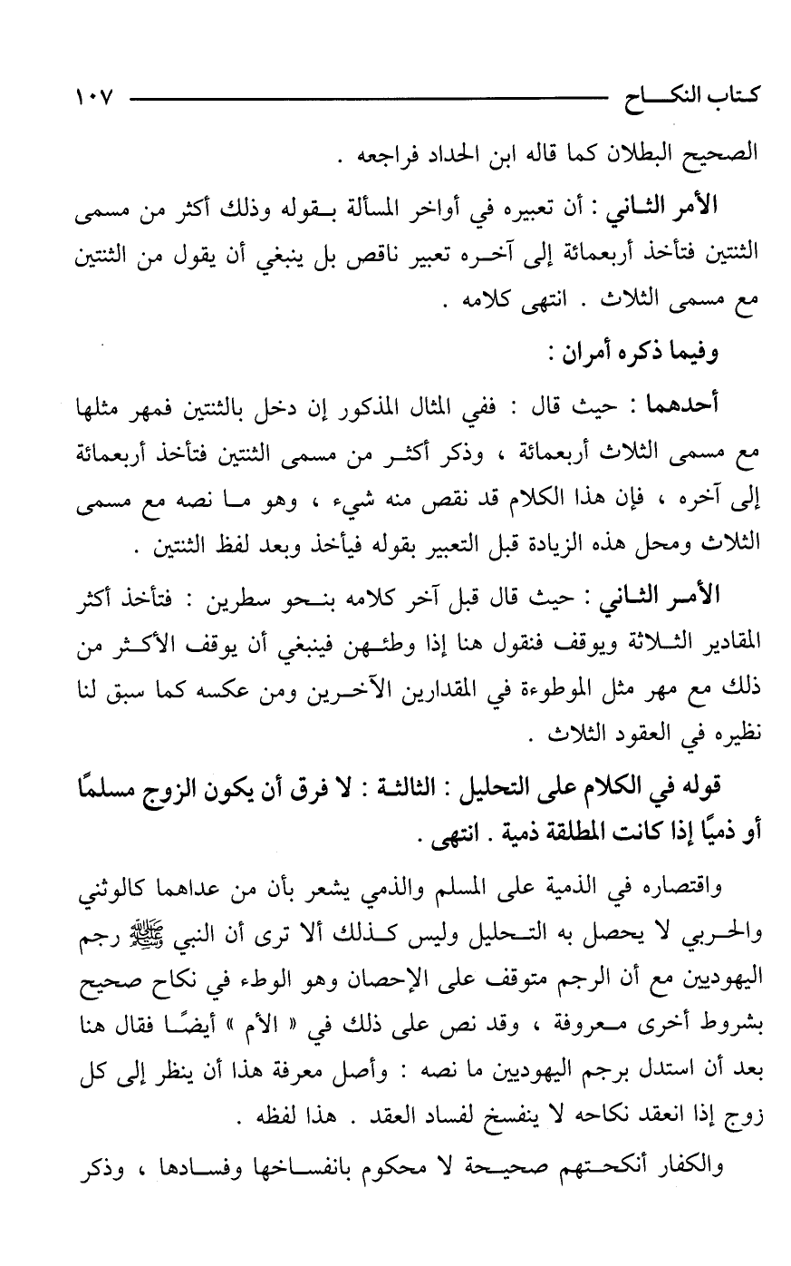 واقتصاره في الذمية على المسلم والذمي يشعر بأن من عداهما كالوثني والحربي لا يحصل به التحليل وليس كذلك ألا ترى أن النبي - صَلَّى اللَّهُ عَلَيْهِ وَسَلَّمَ - رجم اليهوديين مع أن الرجم متوقف على الإحصان وهو الوطء في نكاح صحيح بشروط أخرى معروفة، وقد نص على ذلك في "الأم" أيضًا فقال هنا بعد أن استدل برجم اليهوديين ما نصه: وأصل معرفة هذا أن ينظر إلى كل زوج إذا انعقد نكاحه لا ينفسخ لفساد العقد. هذا لفظه.
