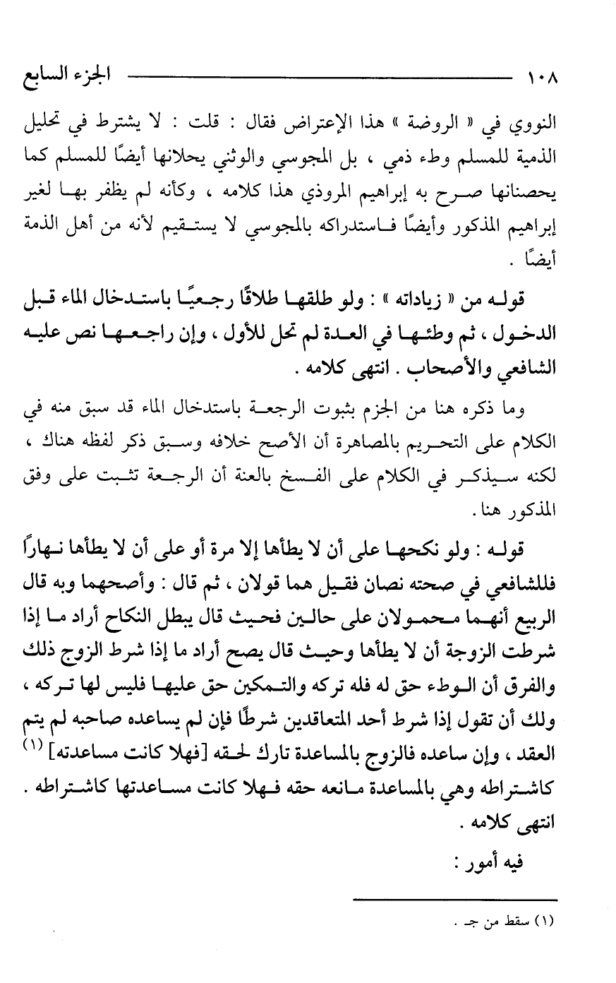 النووي في "الروضة" هذا الإعتراض فقال: قلت: لا يشترط في تحليل الذمية للمسلم وطء ذمي، بل المجوسي والوثني يحلانها أيضًا للمسلم كما يحصنانها صرح به إبراهيم المروذي هذا كلامه، وكأنه لم يظفر بها لغير إبراهيم المذكور وأيضًا فاستدراكه بالمجوسي لا يستقيم لأنه من أهل الذمة أيضًا.