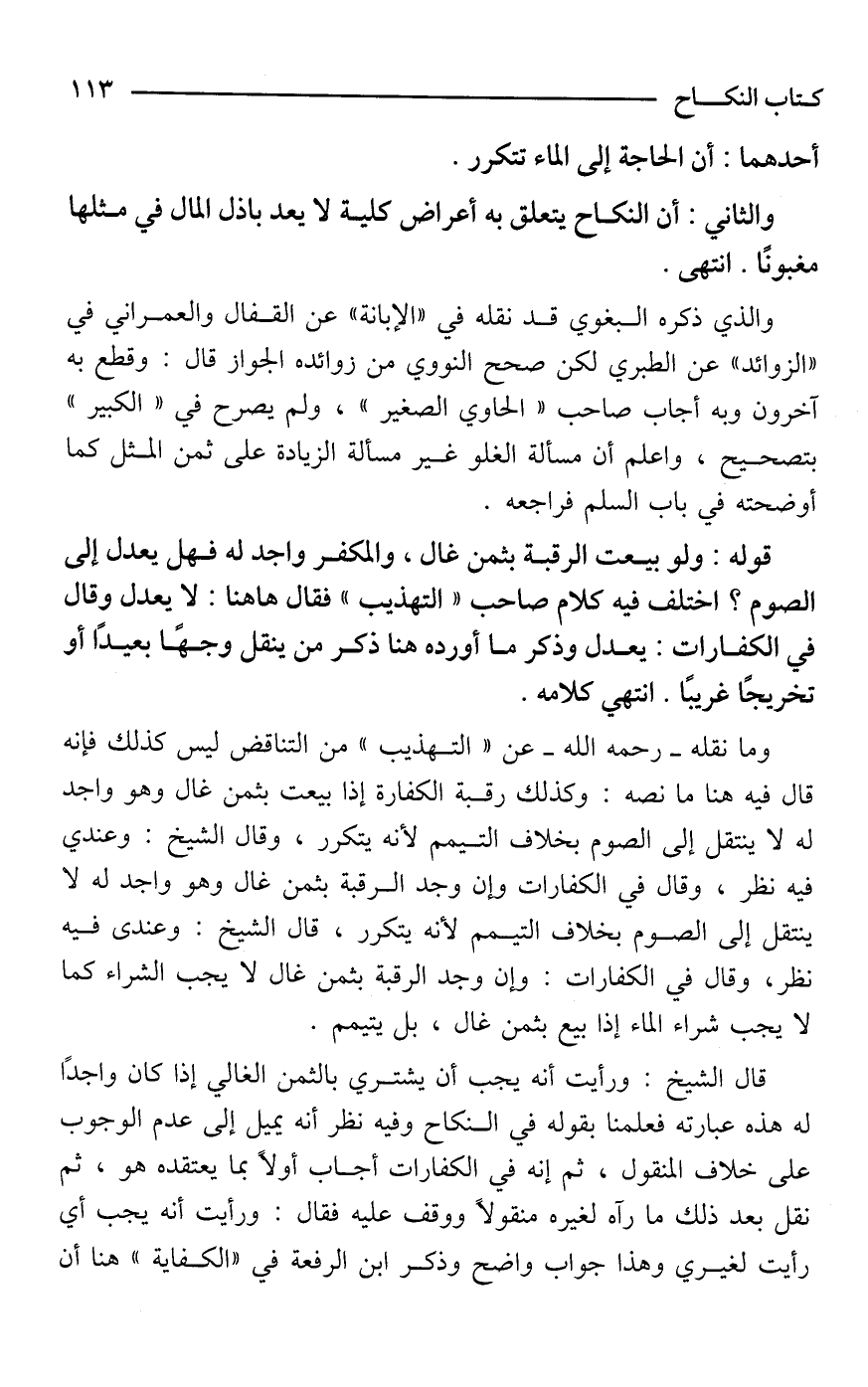 قال الشيخ: ورأيت أنه يجب أن يشتري بالثمن الغالي إذا كان واجدًا له هذه عبارته فعلمنا بقوله في النكاح وفيه نظر أنه يميل إلى عدم الوجوب على خلاف المنقول، ثم إنه في الكفارات أجاب أولًا بما يعتقده هو، ثم نقل بعد ذلك ما رآه لغيره منقولًا ووقف عليه فقال: ورأيت أنه يجب أي رأيت لغيري وهذا جواب واضح وذكر ابن الرفعة في "الكفاية" هنا أن