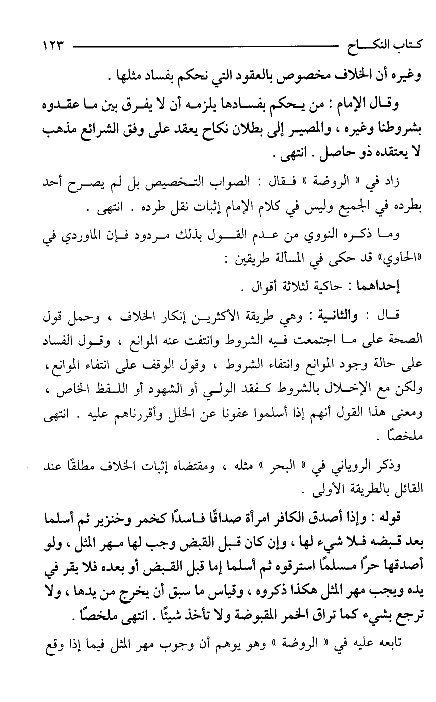 قال: والثانية: وهي طريقة الأكثرين إنكار الخلاف، وحمل قول الصحة على ما اجتمعت فيه الشروط وانتفت عنه الموانع، وقول الفساد على حالة وجود الموانع وانتفاء الشروط، وقول الوقف على انتفاء الموانع، ولكن مع الإخلال بالشروط كفقد الولي أو الشهود أو اللفظ الخاص، ومعنى هذا القول أنهم إذا أسلموا عفونا عن الخلل وأقررناهم عليه. انتهى ملخصًا.